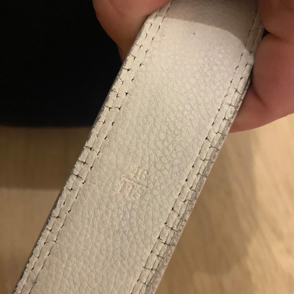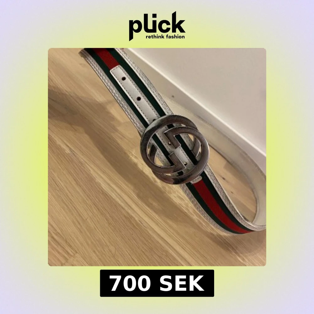 Snyggt bälte från gucci. Bältet har vit bas med gröna och röda ränder längs hela bandet. Tillverkat i skinn med tydliga sömmar och bred design. Perfekt accessoar för att lyfta din outfit. Bältet är 115 cm. Väldigt snyggt bälte som ger en lyxig känsla. Vintage gucci bälte.
