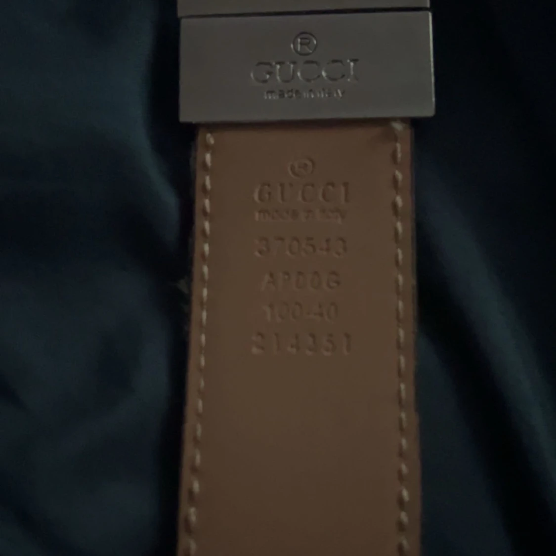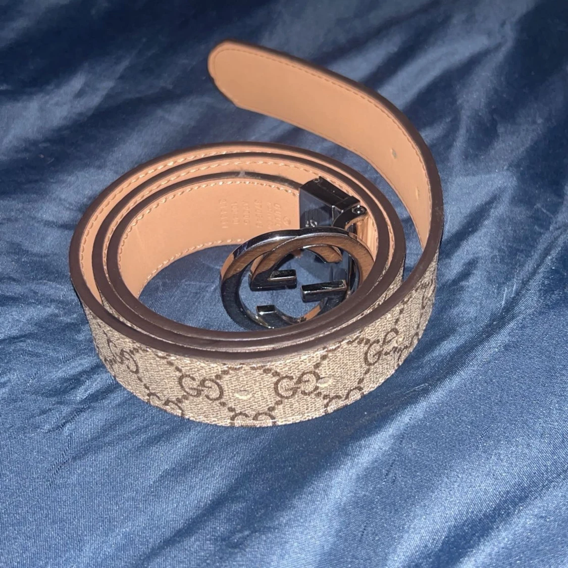 Snyggt Gucci GG Supreme bälte i beige och brunt med klassiskt monogrammönster och GG-spänne i silver. Bältet är gjort i skinn och canvas, perfekt för att lyfta vilken outfit som helst. Kommer med originalbox och dustbag.
