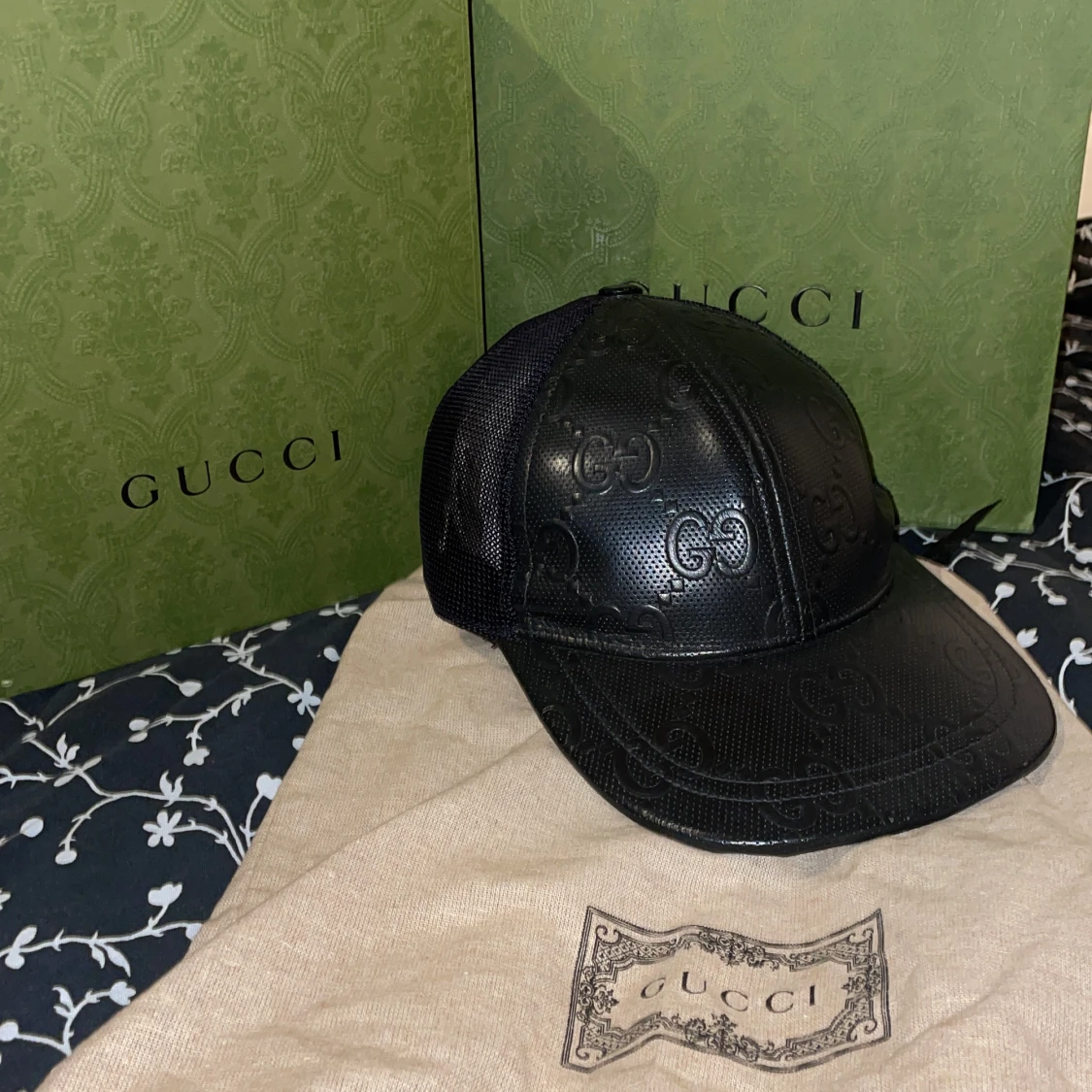 Det här är en svart gucci kepps i läder som är rätt som ovanlig storlek L men passar dem flesta/ box dushbag låda påse osv följer med(: nypris 5k+ priset inte hugget i sten mvh Tim