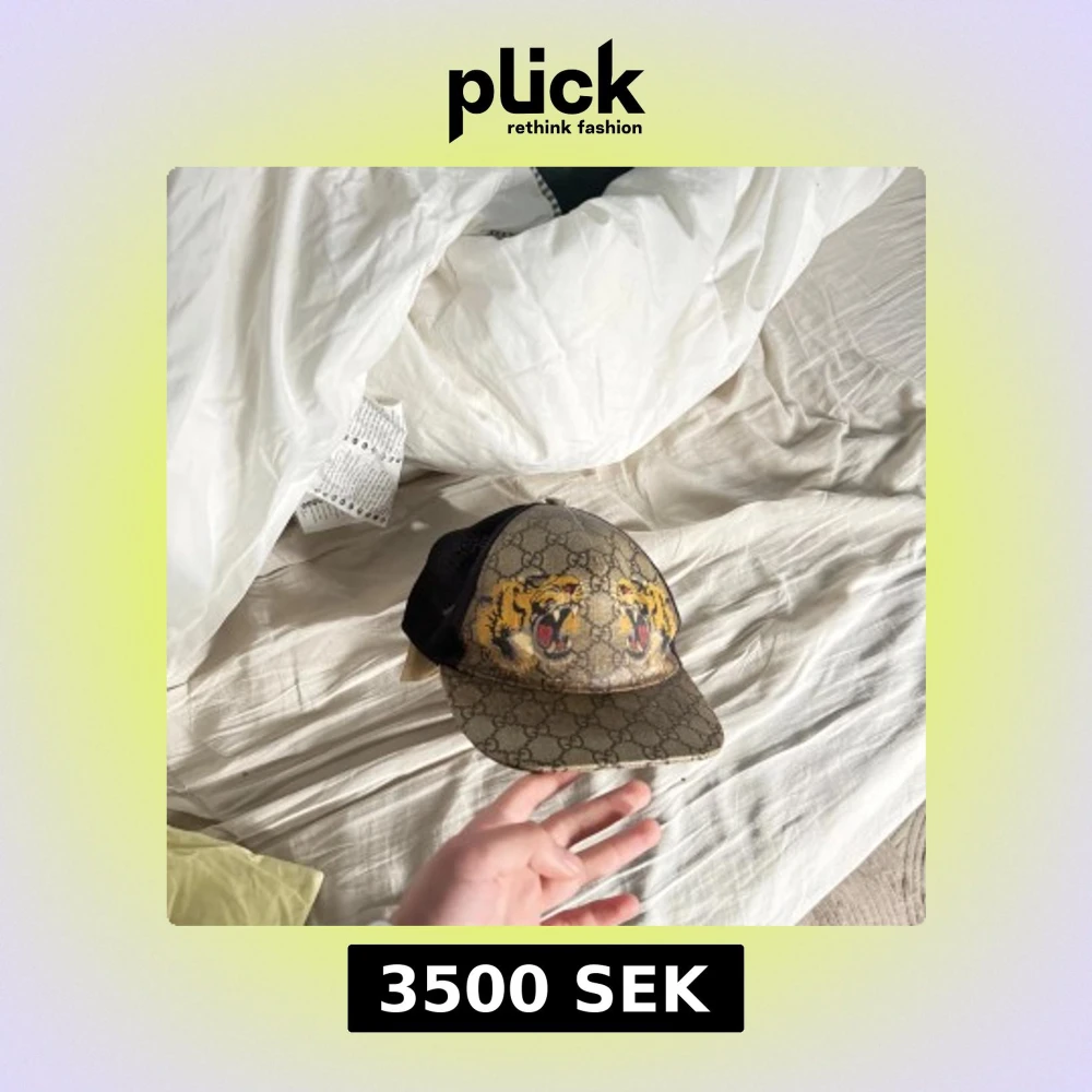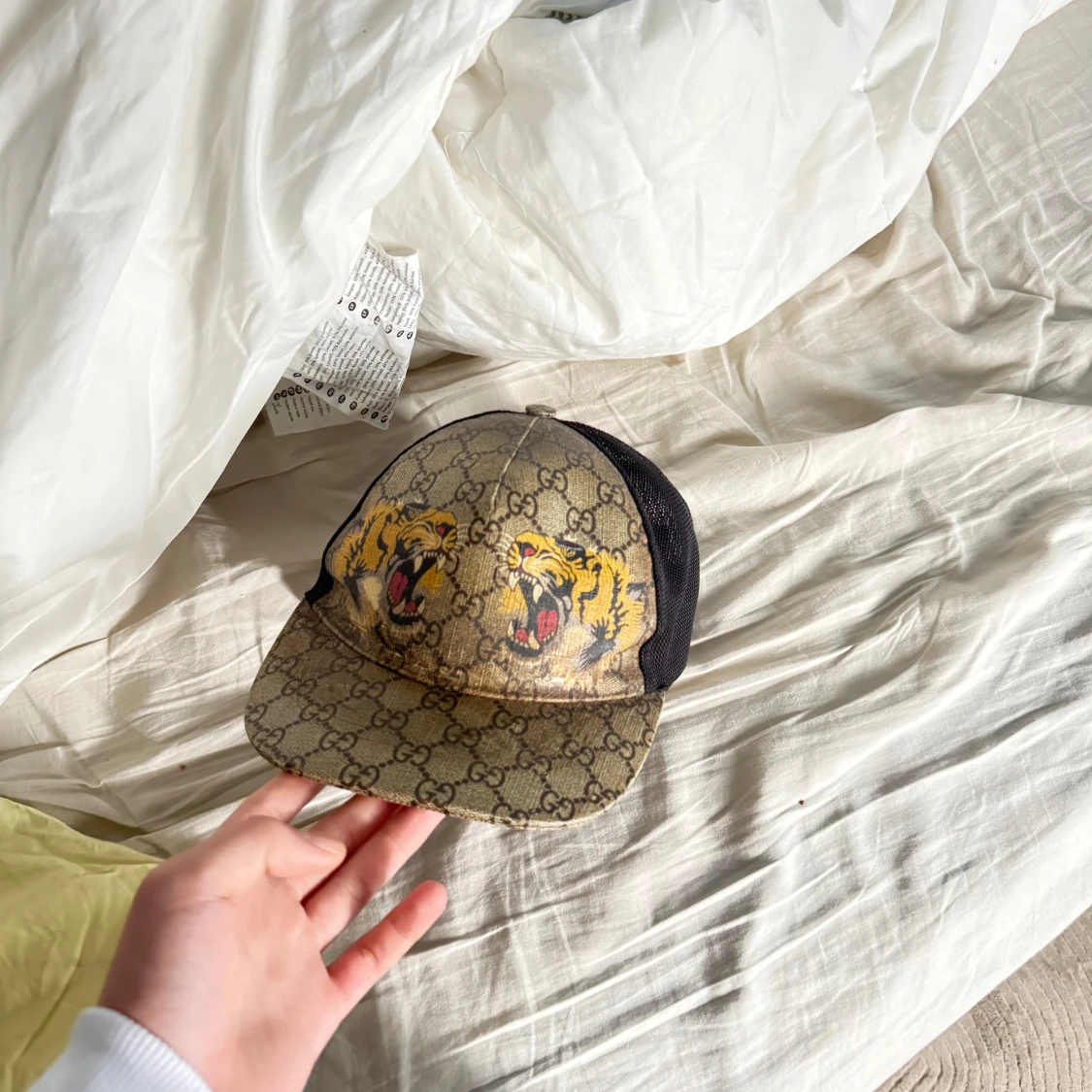 Säljer en beige och svart keps från Gucci med klassiskt GG-mönster och två tigrar framtill. Kepsen har svart mesh på baksidan och justerbar passform. Perfekt för dig som vill sticka ut med en lyxig accessoar.