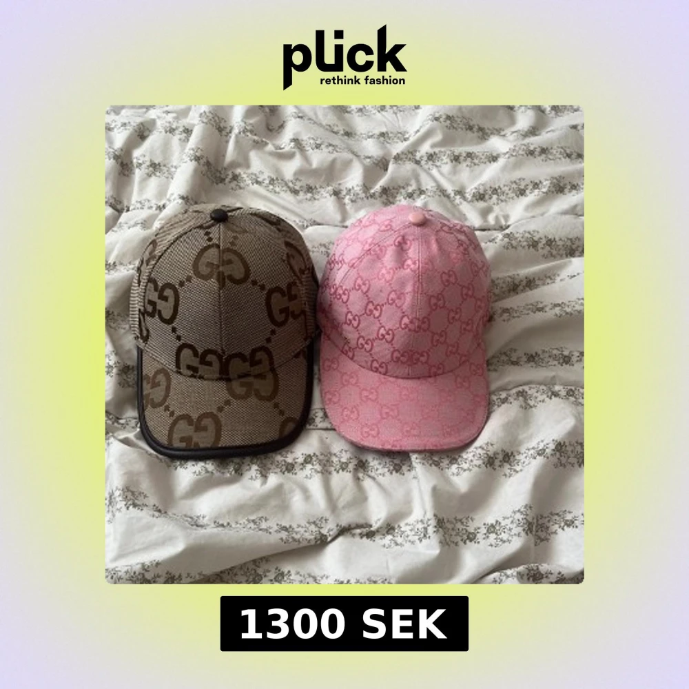 Två snygga Gucci kepsar med klassiskt GG-mönster. Ena kepsen är beige med bruna detaljer och den andra är rosa med ljusrosa GG-loggor. Båda har justerbar rem bak i matchande färg och är tillverkade i bomull. Perfekt för dig som vill sticka ut med lyxig streetstyle.