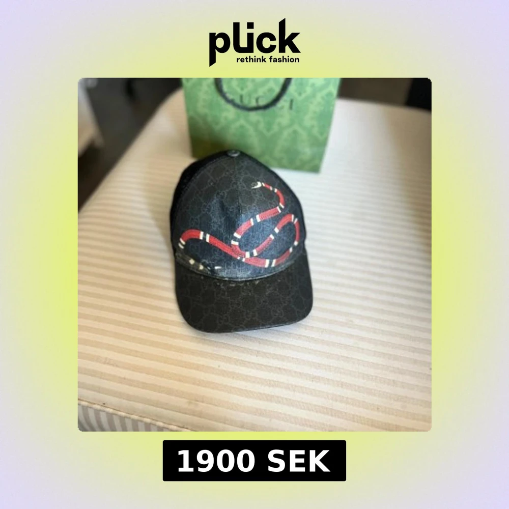 Säljer en svart keps från Gucci med ikoniskt orm-motiv framtill och diskret GG-mönster i bakgrunden. Kepsen har justerbar rem baktill med röd-blå detalj och mesh-paneler på sidorna för extra ventilation.