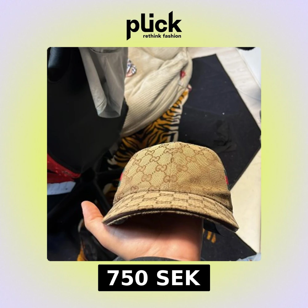 Säljer en beige keps från Gucci med klassiskt GG-monogram över hela kepsen och en bred röd-grön rand på sidan. Justerbar rem baktill i brunt läder. Perfekt accessoar för att lyfta din stil.