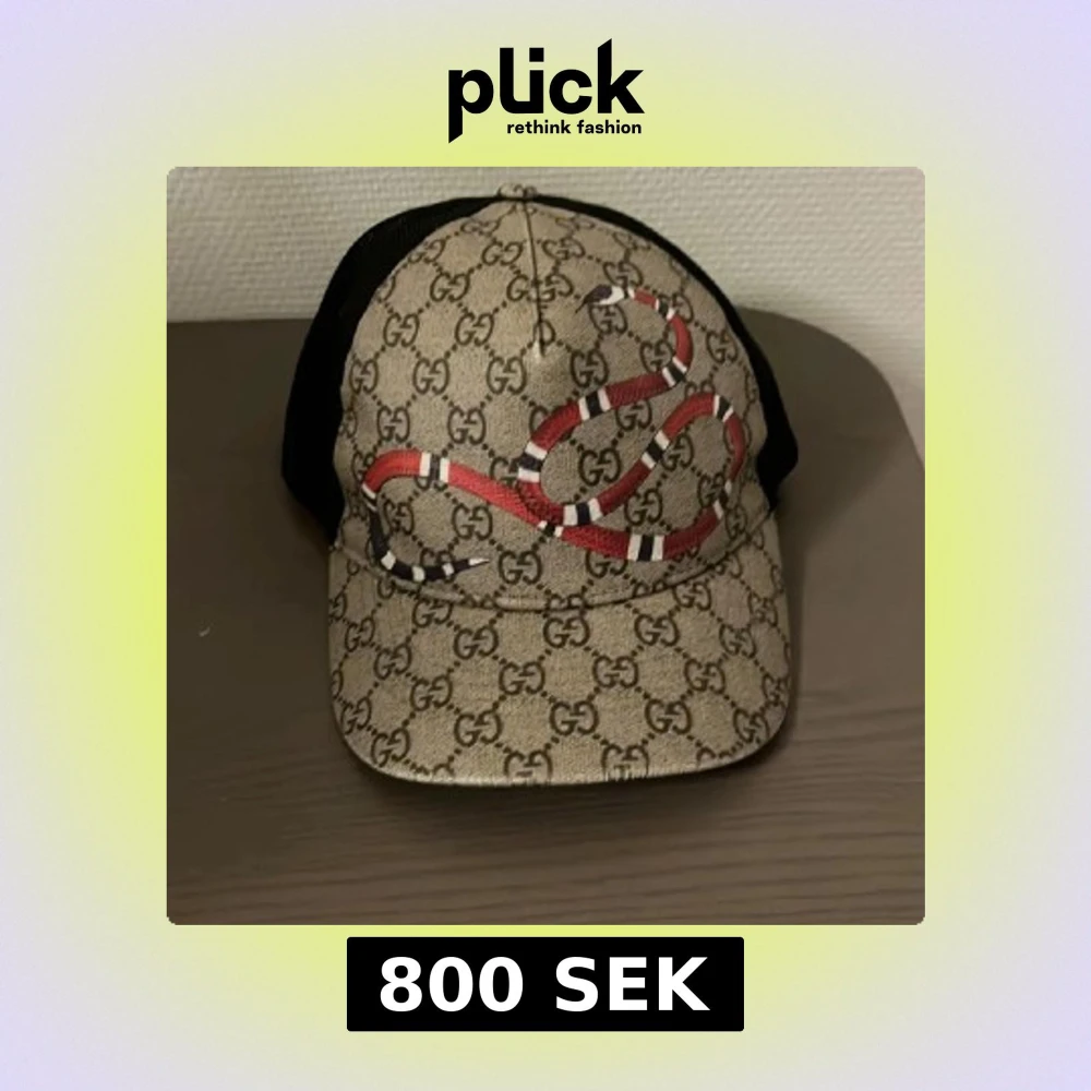 Säljer en beige och svart keps från Gucci med klassiskt GG-mönster och en röd orm på framsidan. Kepsen har justerbar rem baktill med röd och grön detalj samt svart mesh på sidorna och baksidan.