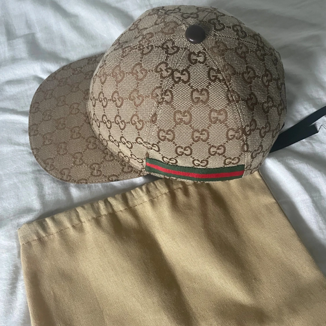 Säljer en beige keps från Gucci med klassiskt GG-monogram över hela kepsen. Kepsen har en böjd skärm och en ikonisk grön/röd rand på sidan. Kommer med en dustbag. Använt några få gånger. Kontakta gärna om ni har frågor. Pris kan diskuteras.