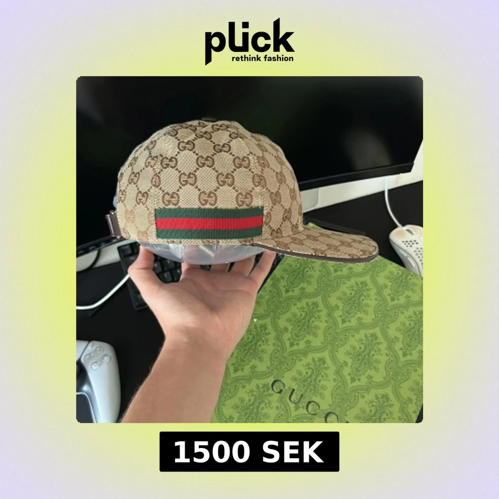 Säljer en beige keps från Gucci med klassiskt GG-monogram över hela kepsen och en grön-röd rand på sidan. Kepsen har böjd skärm, justerbar rem baktill och är tillverkad i bomullsmaterial. Perfekt för dig som gillar exklusiva accessoarer. + Gucci Boxen