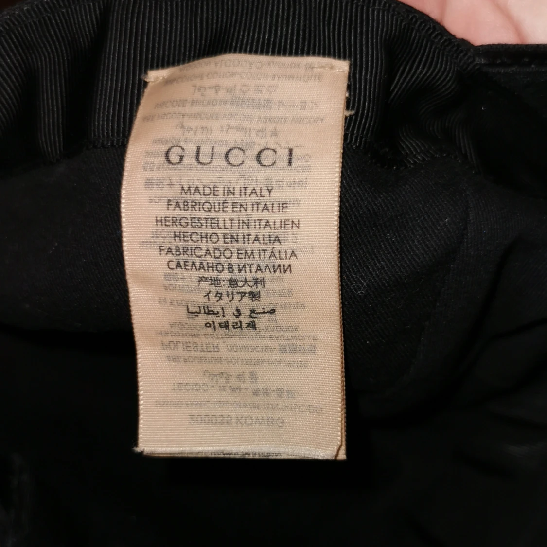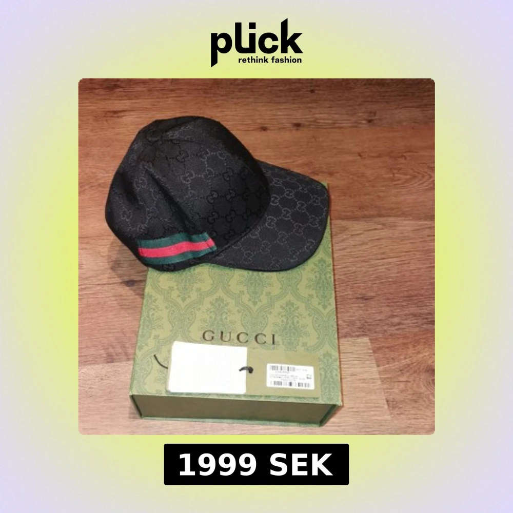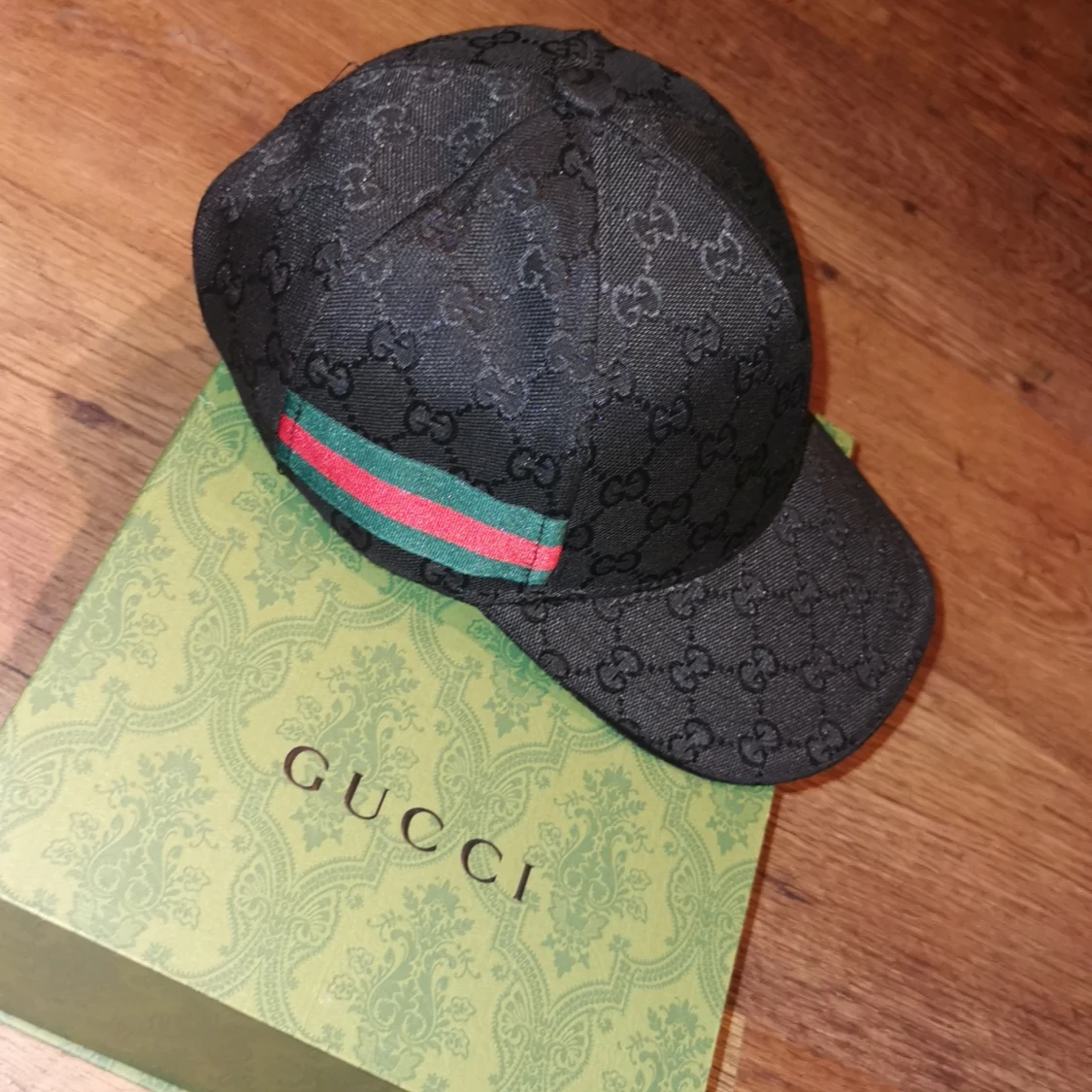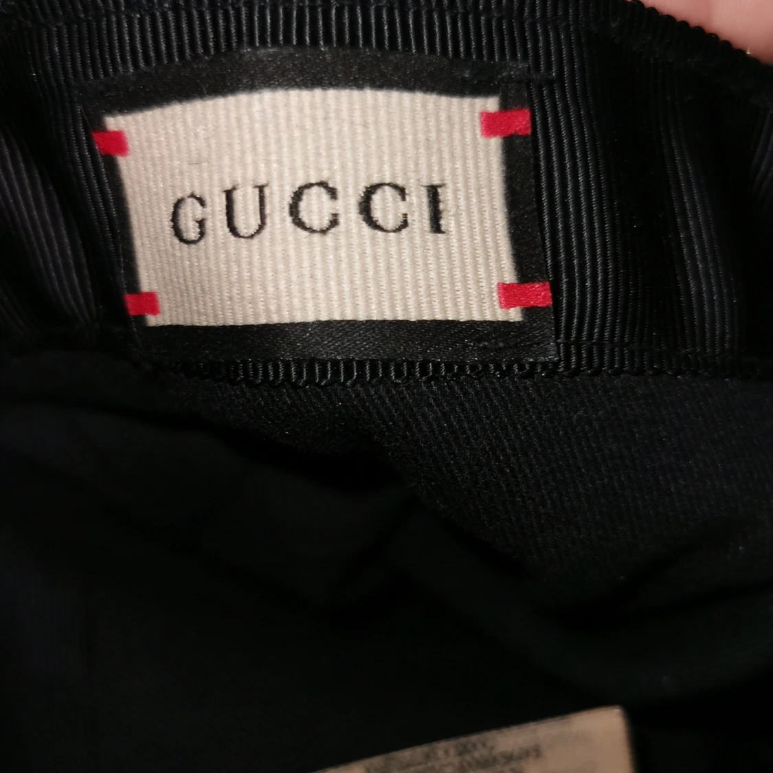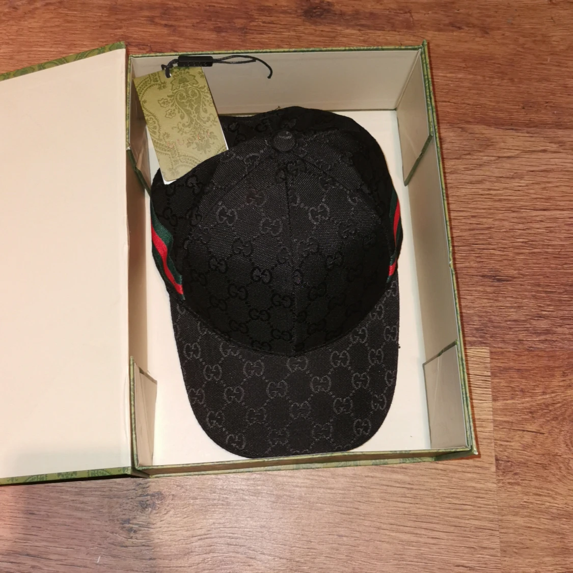 Snygg svart keps från Gucci med det ikoniska GG-mönstret och röd-gröna ränder på sidan. Perfekt för att ge din outfit en lyxig touch. Kepsen kommer i originalförpackning.