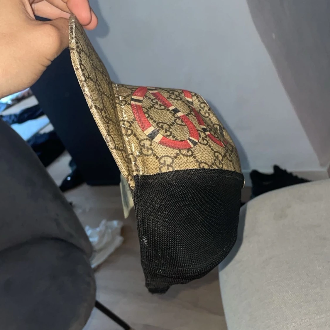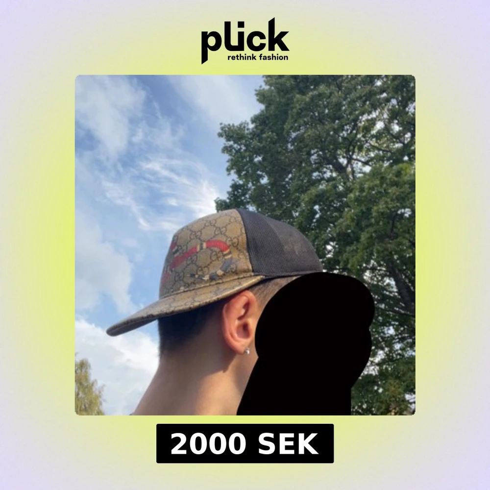 Säljer en Gucci keps med klassiskt GG-monogram i beige och brunt, prydd med en röd och svart orm framtill. Baksidan är i svart mesh och justerbar med grön-röd randig rem. Perfekt för dig som vill sticka ut med en ikonisk accessoar. Tillverkas ej längre.