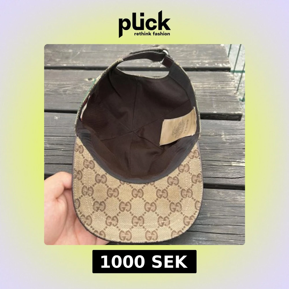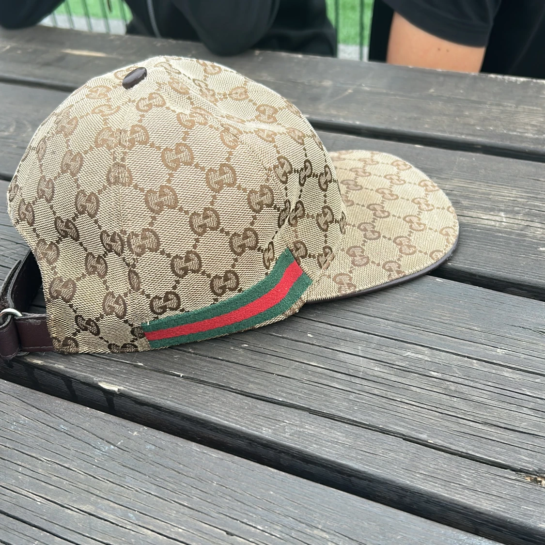 Snygg keps från Gucci i beige och brunt med klassiskt GG-monogram över hela kepsen. Har justerbar rem bak i mörkbrunt och ikonisk röd/grön rand på sidan. Perfekt accessoar för dig som vill sticka ut med lyxig streetstyle.