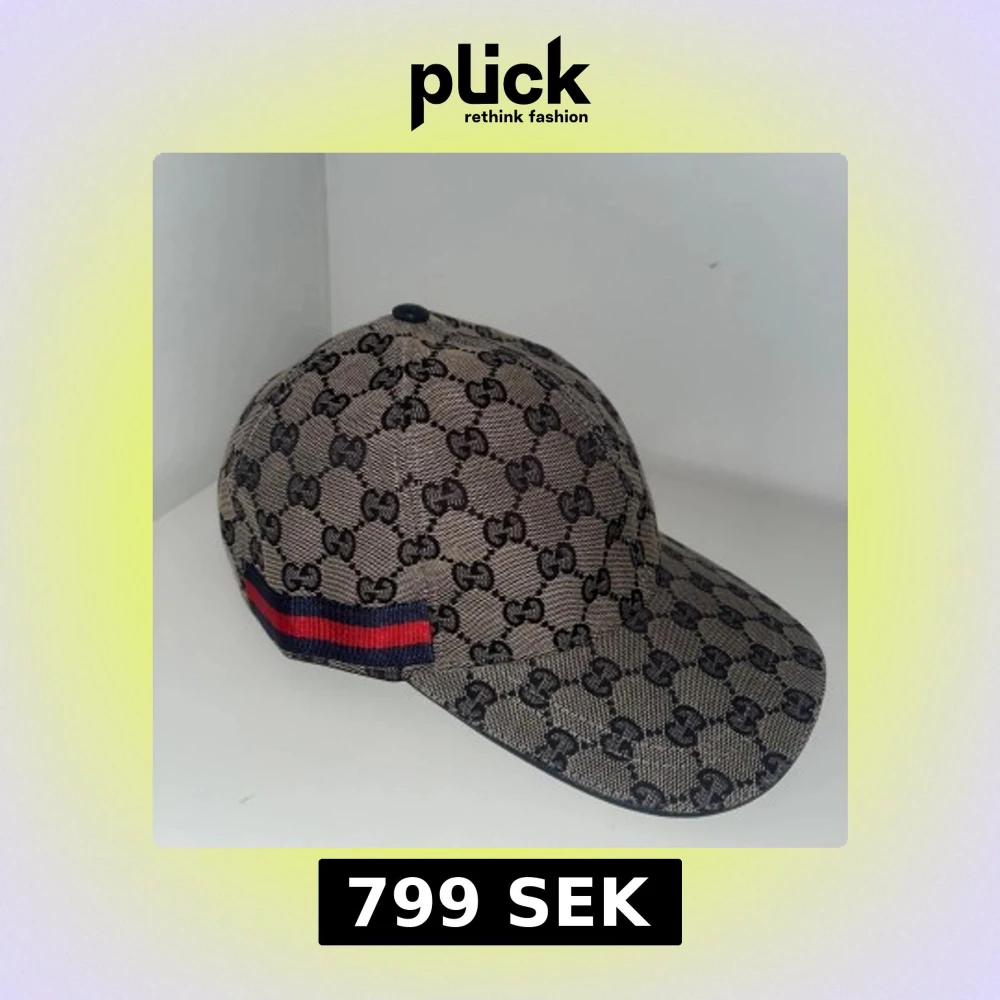Snygg keps från Gucci i beige med klassiskt GG-monogram över hela kepsen. Har en röd och blå rand på sidan och justerbar rem i mörkblått skinn baktill. Perfekt för dig som vill sticka ut med en lyxig accessoar.