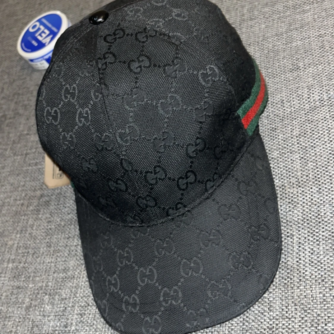 ”ÄKTAA”. Säljer en svart keps från Gucci med klassiskt GG-monogram över hela kepsen. Den har en böjd skärm och justerbar rem baktill. På sidan finns en ikonisk grön och röd rand. Materialet är slitstark bomull och kepsen är tillverkad i Italien.