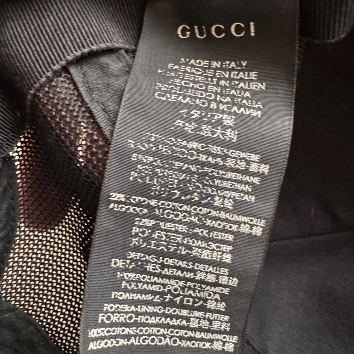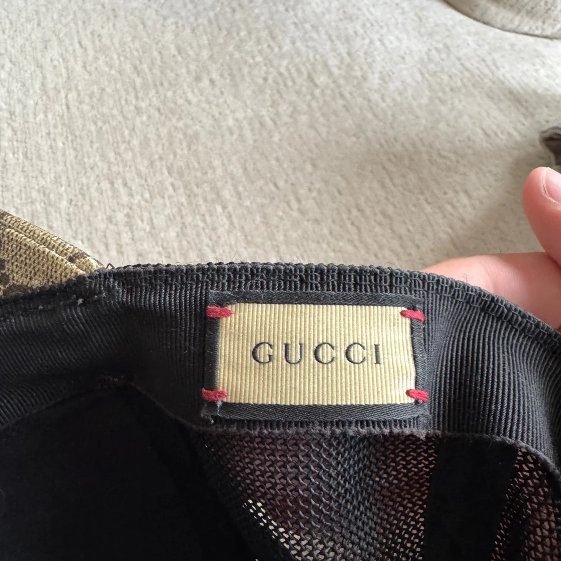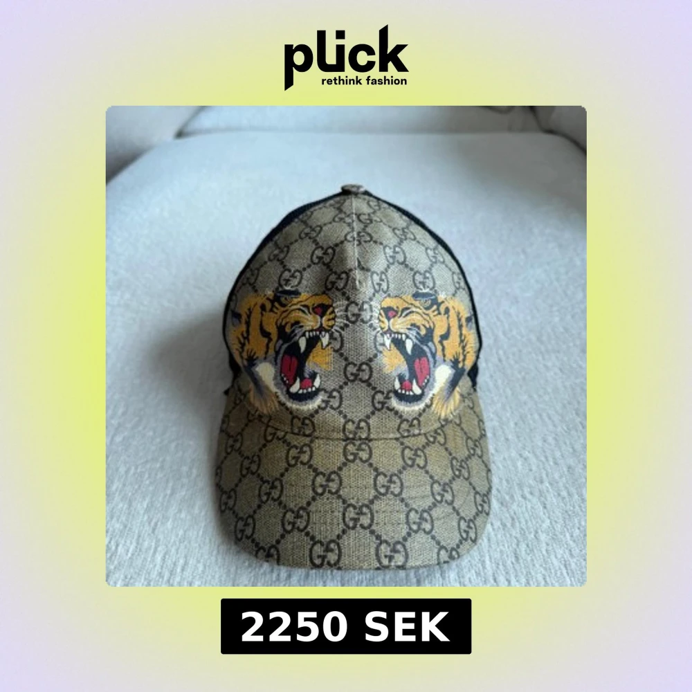 ÄKTA Snygg keps från Gucci med klassiskt GG-mönster i beige och brunt, prydd med två ilskna tigrar framtill. Baksidan har svart mesh och justerbart band i grönt och rött. Materialmix av bomull och polyester, perfekt för dig som vill sticka ut. Billigaste på StockX kostar 5000kr.