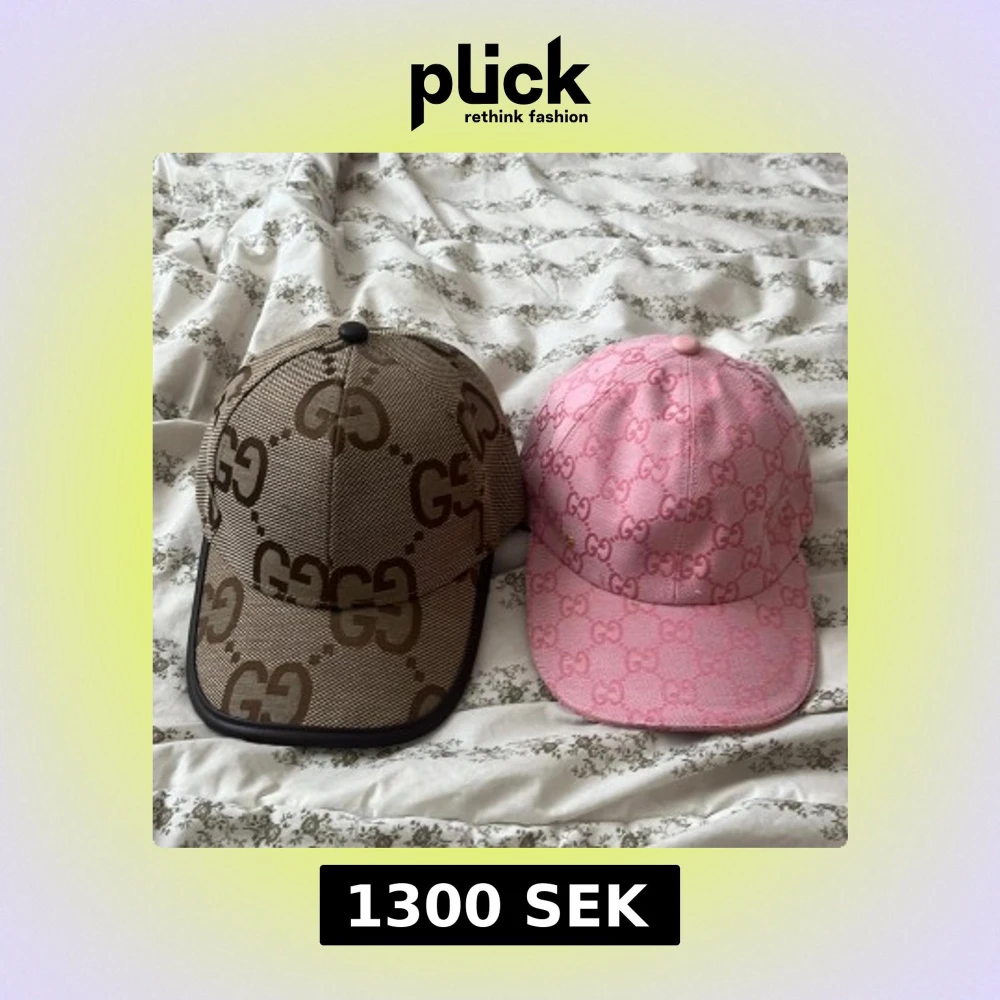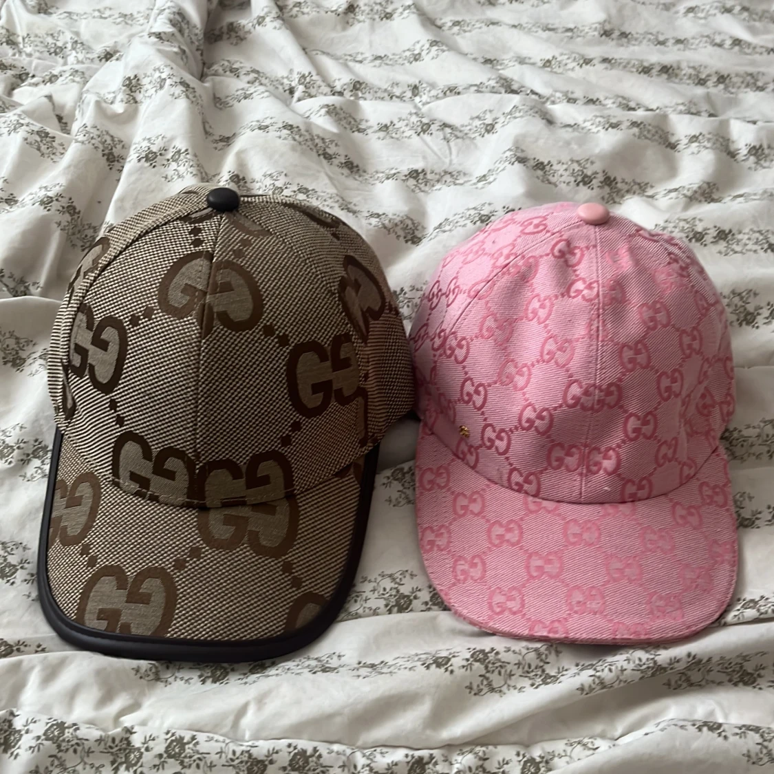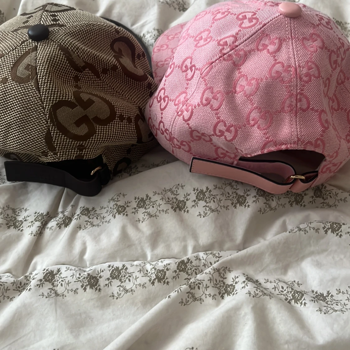 Två snygga Gucci kepsar med klassiskt GG-mönster. Ena kepsen är beige och brun med stora GG-loggor och svart kant, den andra är rosa med ljusrosa GG-mönster och rosa knapp. Båda har justerbar rem baktill och är tillverkade i bomullstyg med detaljer i läder.