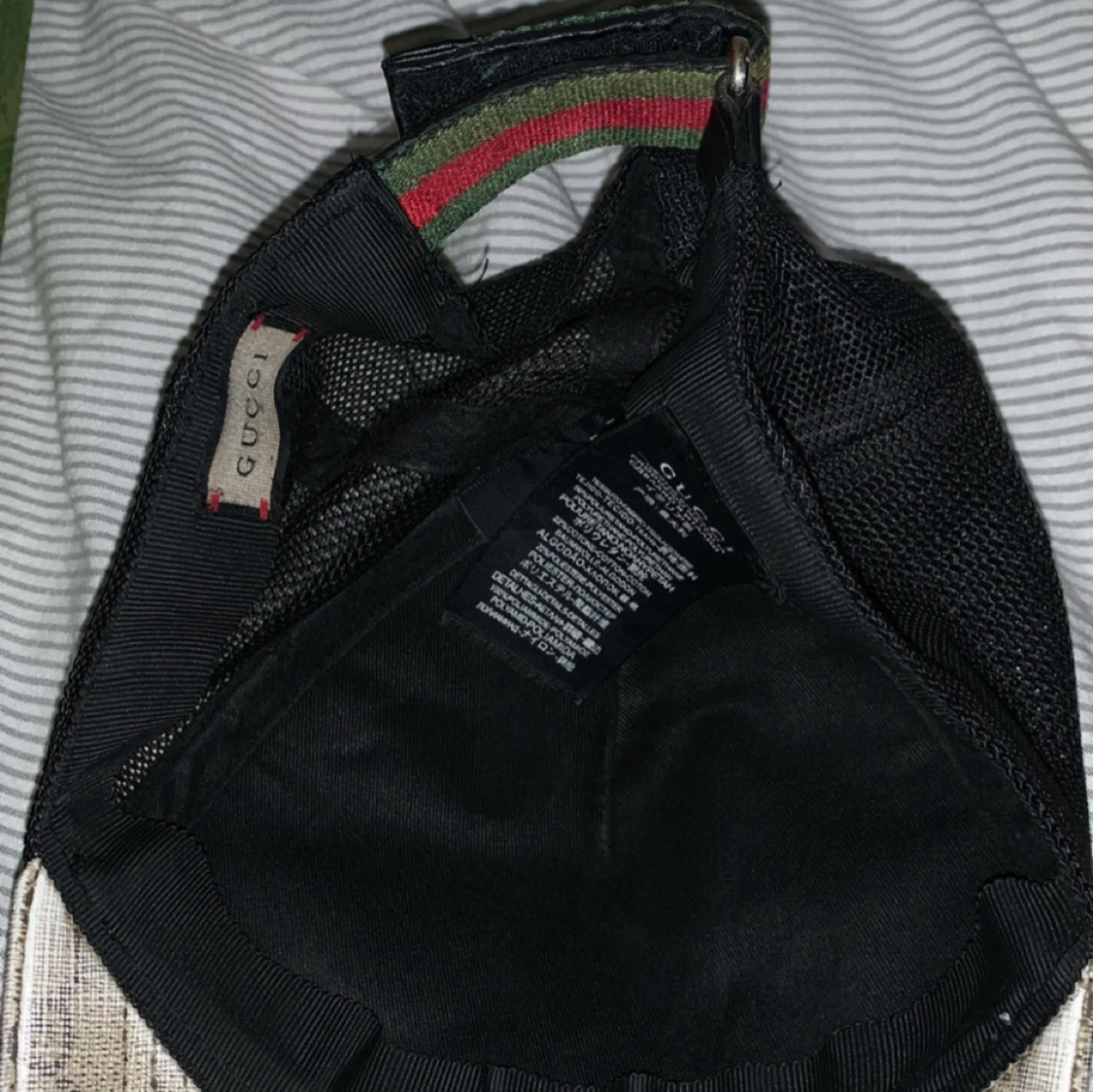 Säljer en exklusiv Gucci keps med klassiskt GG-monogram i beige och brunt, dekorerad med en röd orm på framsidan. Kepsen har svart mesh baktill och justerbart band med gröna och röda ränder. Materialet är bomull och polyester. Box och dustbag medföljer.