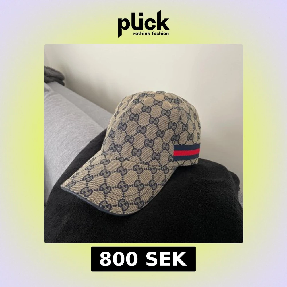 Säljer en beige keps från Gucci med klassiskt GG-monogram i mörkblått och röd-blå rand på sidan. Kepsen har böjd skärm och justerbar passform. Perfekt accessoar för en trendig look.