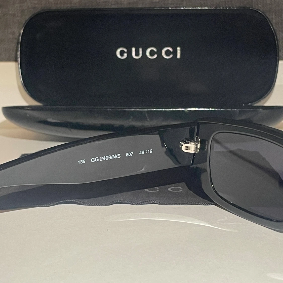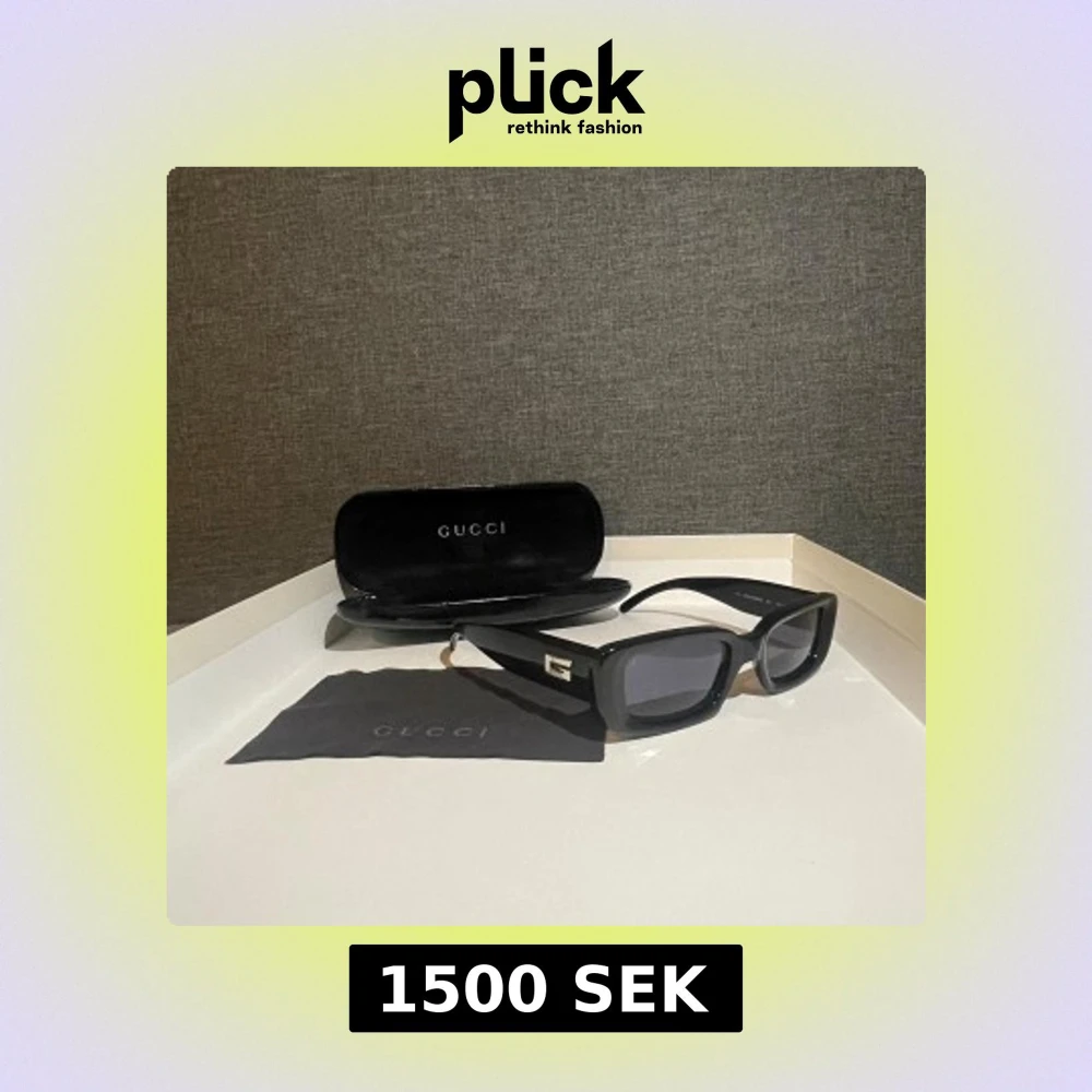 Snygga svarta solglasögon från Gucci med rektangulär form och breda skalmar. Modellen heter GG 2409/N/S och har en silverfärgad Gucci-detalj på sidan. Kommer med originalfodral och putsduk. Perfekt accessoar för en trendig look.