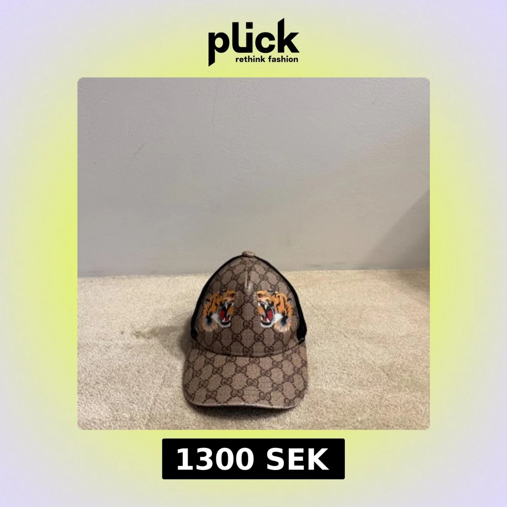 Säljer en snygg keps från Gucci med klassiskt GG-mönster i beige och brunt, två tigrar framtill och svart mesh baktill. Justerbar rem med grönt och rött band. Perfekt accessoar för att lyfta din outfit.
