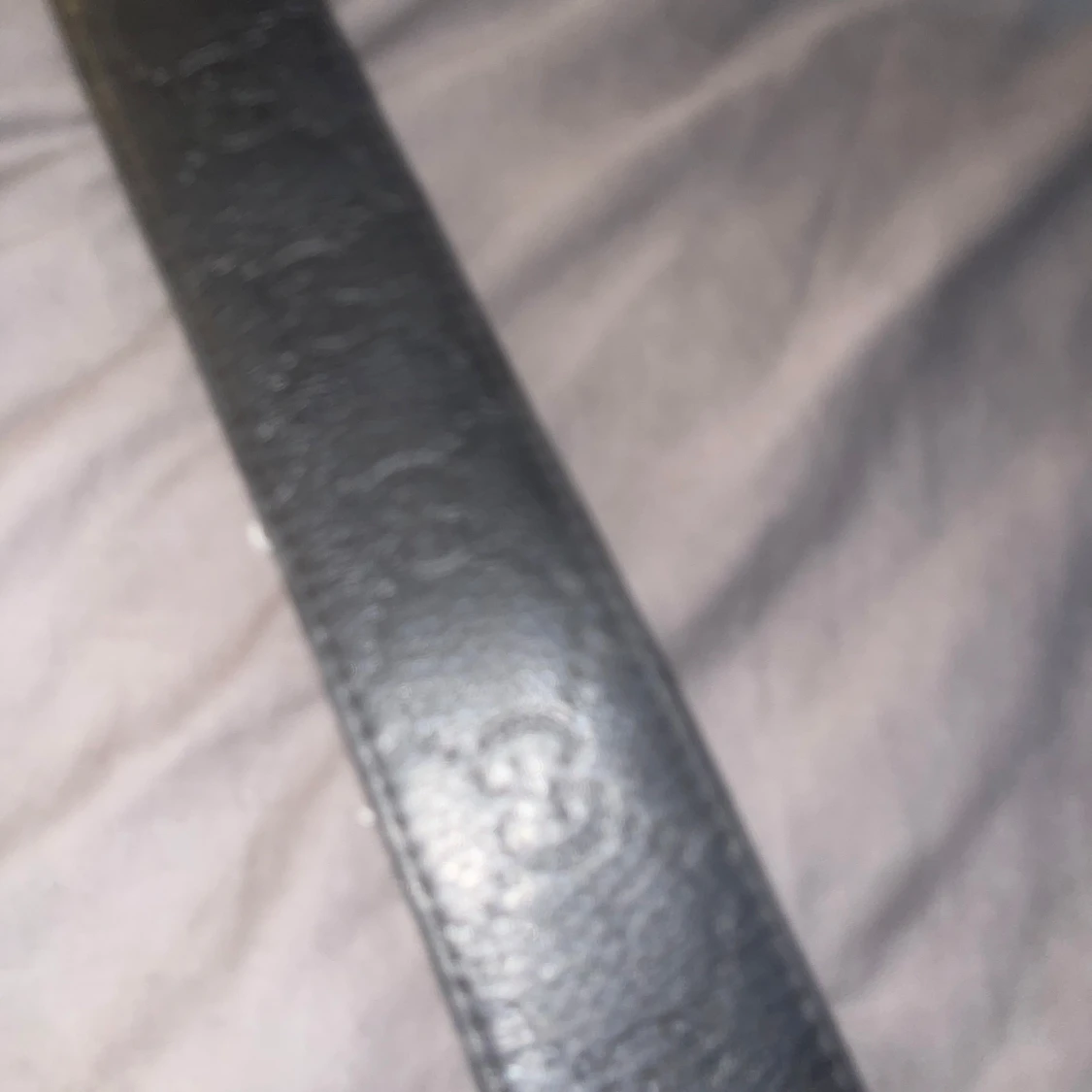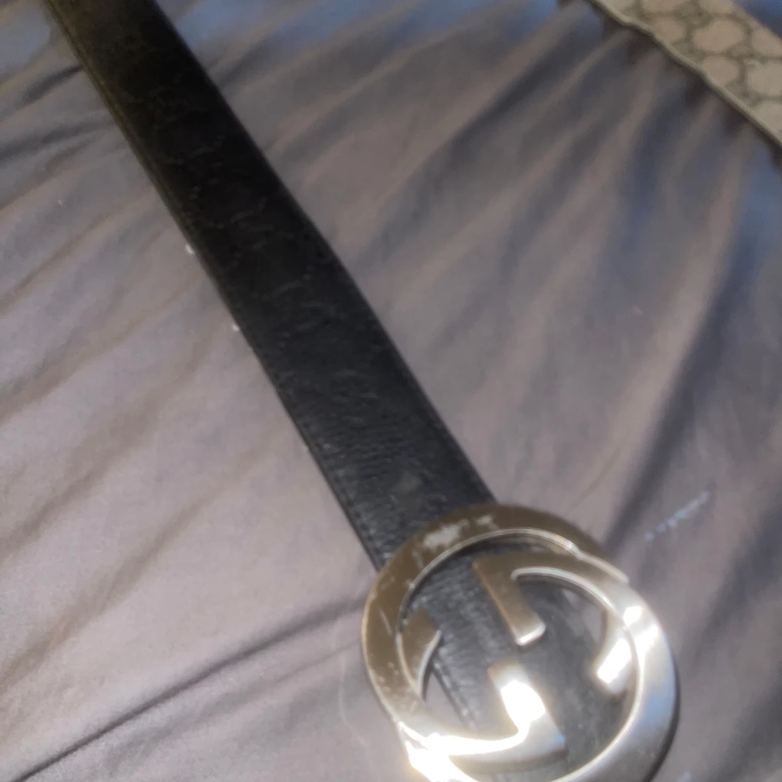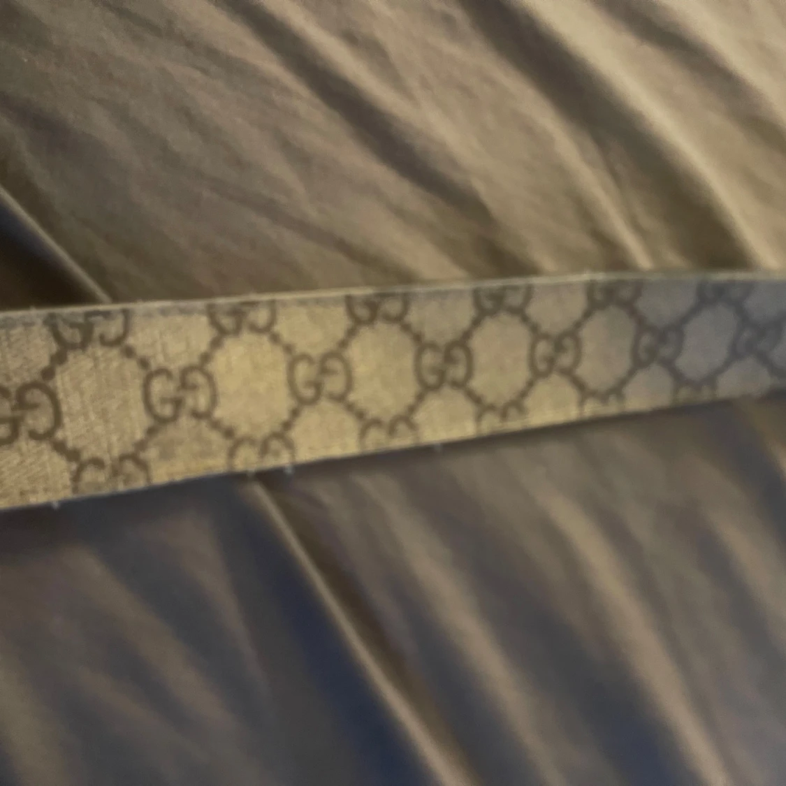 Säljer ett snyggt Gucci-bälte med klassiskt GG-mönster. Ena sidan är svart skinn med präglade GG-loggor och stor silvrig GG-spänne, andra sidan är beige med brunt GG-mönster. Perfekt accessoar för att lyfta din outfit. Varan är en 100% äkta vara från Gucci