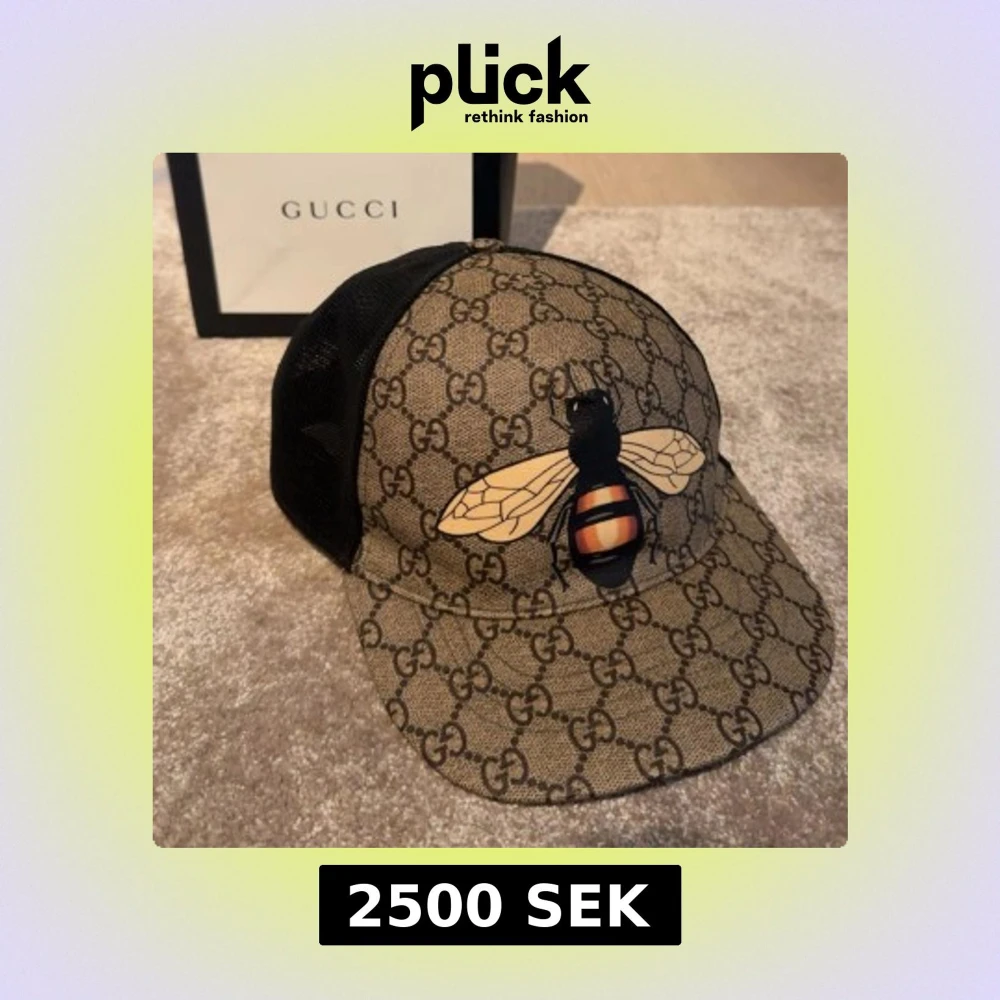Snygg keps från Gucci med klassiskt GG-mönster i beige och brunt, stor broderad bi framtill och svart mesh på sidorna och bak. Justerbar rem med grönt och rött band. Perfekt för dig som vill sticka ut med lyxig streetstyle.