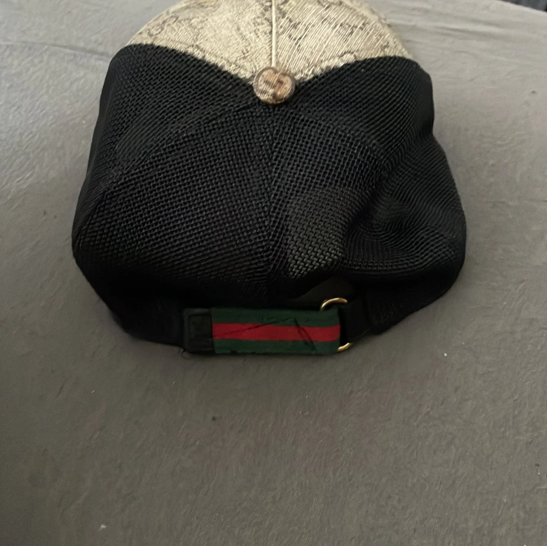 Säljer en snygg Gucci keps med klassiskt GG-mönster i beige och brunt, prydd med två coola tigerhuvuden framtill. Baksidan har svart mesh och justerbart band med gröna och röda ränder. Perfekt statement piece för dig som gillar lyx och streetstyle.