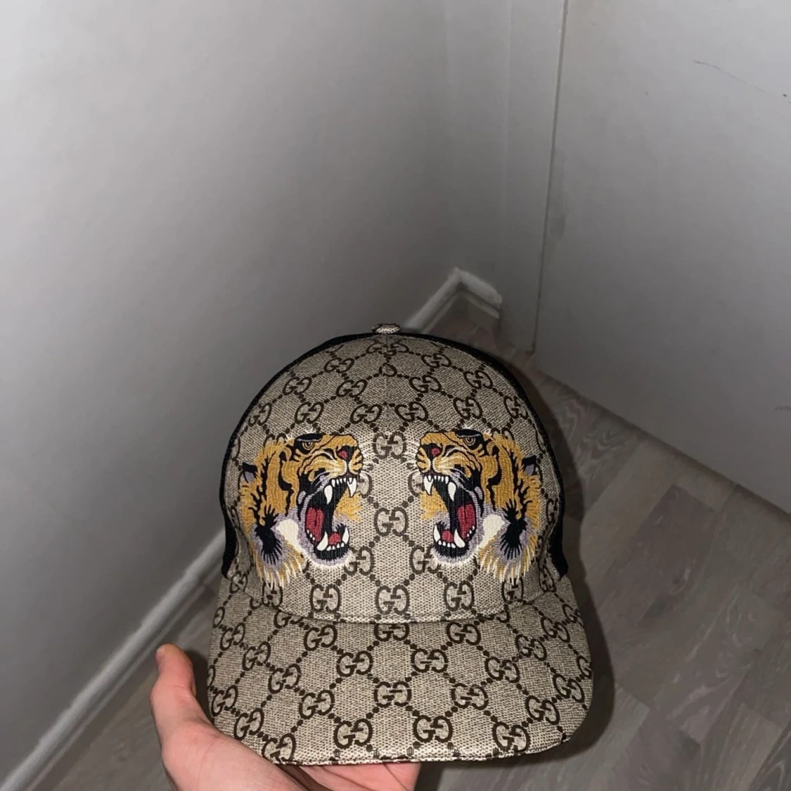 Säljer en exklusiv Gucci keps med klassiskt GG-monogram i beige och brunt, prydd med två broderade tigrar framtill. Baksidan har justerbart band i grönt och rött. Kepsen är tillverkad i bomull och mesh för skön passform. Perfekt för dig som vill sticka ut med lyxig streetstyle samt dustbag ingår med kvittot och den är i storlek S. Helt ny, har inte använt den alls. Den är helt svår och få tag på då man inte kan köpa den nånstans alls eftersom Gucci har slutat producera denna modellen för längese