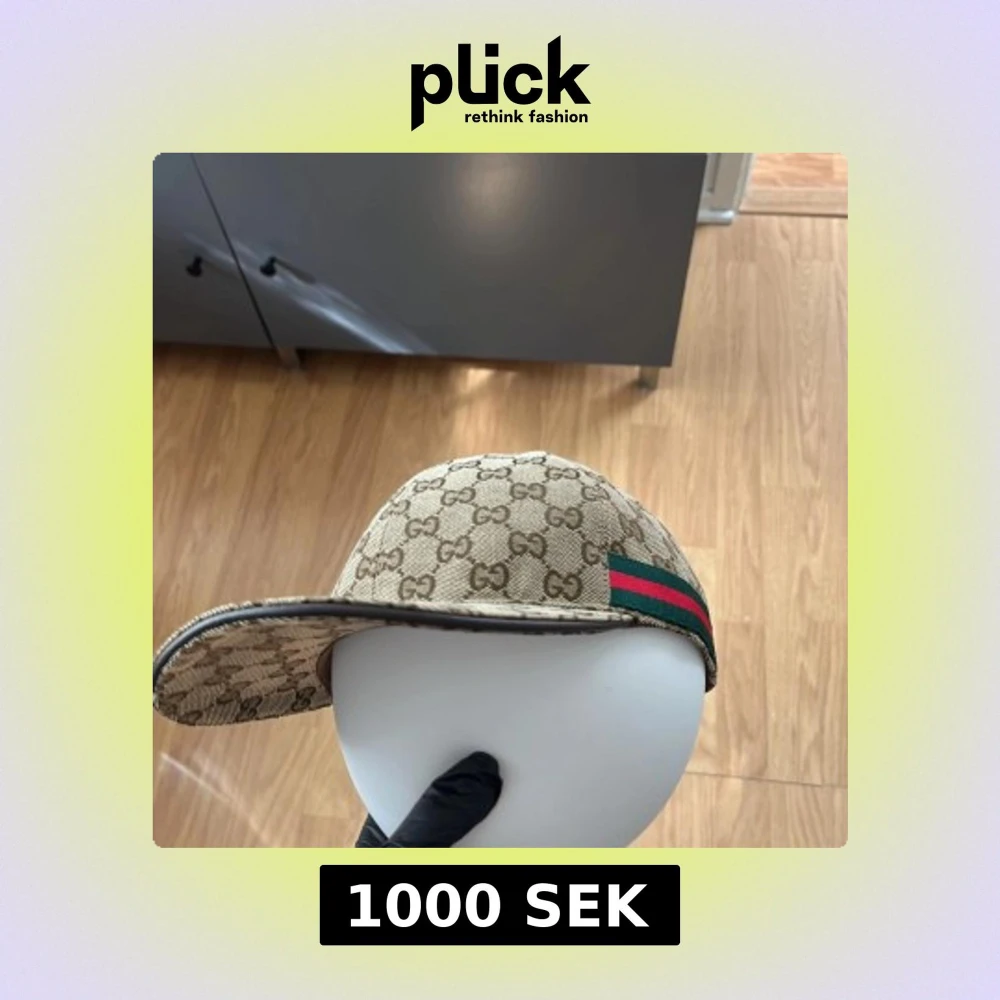 Snygg beige keps från Gucci med klassiskt GG-monogram över hela kepsen. Har grönt och rött band på sidorna och justerbar rem baktill i brunt läder. Perfekt accessoar för en trendig look.