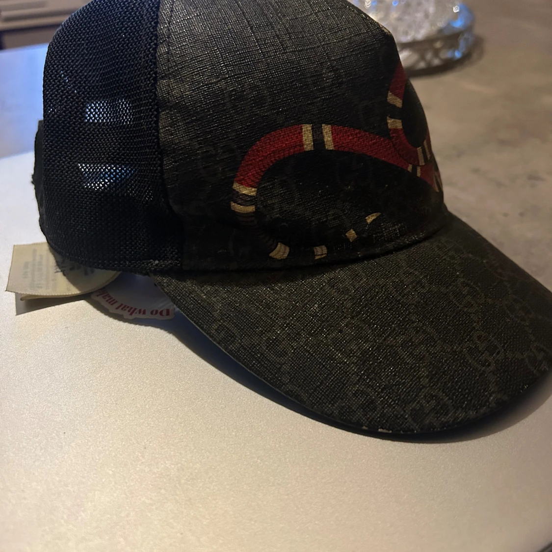 Svart keps från Gucci med mesh på sidorna och bak, samt ett coolt rött och vitt ormprint på framsidan. Kepsen har diskret GG-monogram över hela tyget och justerbar rem bak. Perfekt för dig som vill sticka ut med designeraccessoar.