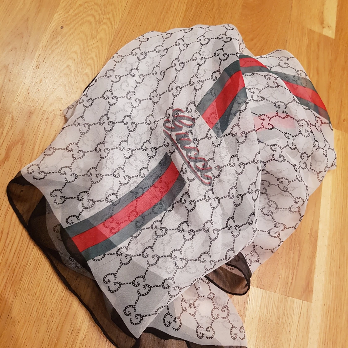 Silkeslen scarf. Svart och vit med klassiska grön/röd stripe. 70x180cm. Köpt på Harrods i London. Går att även få med en påse om man vill :)
