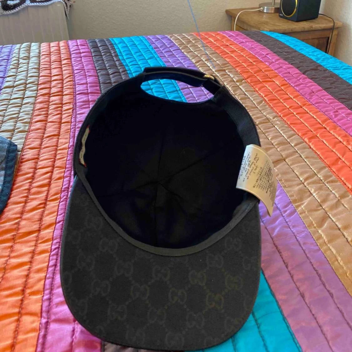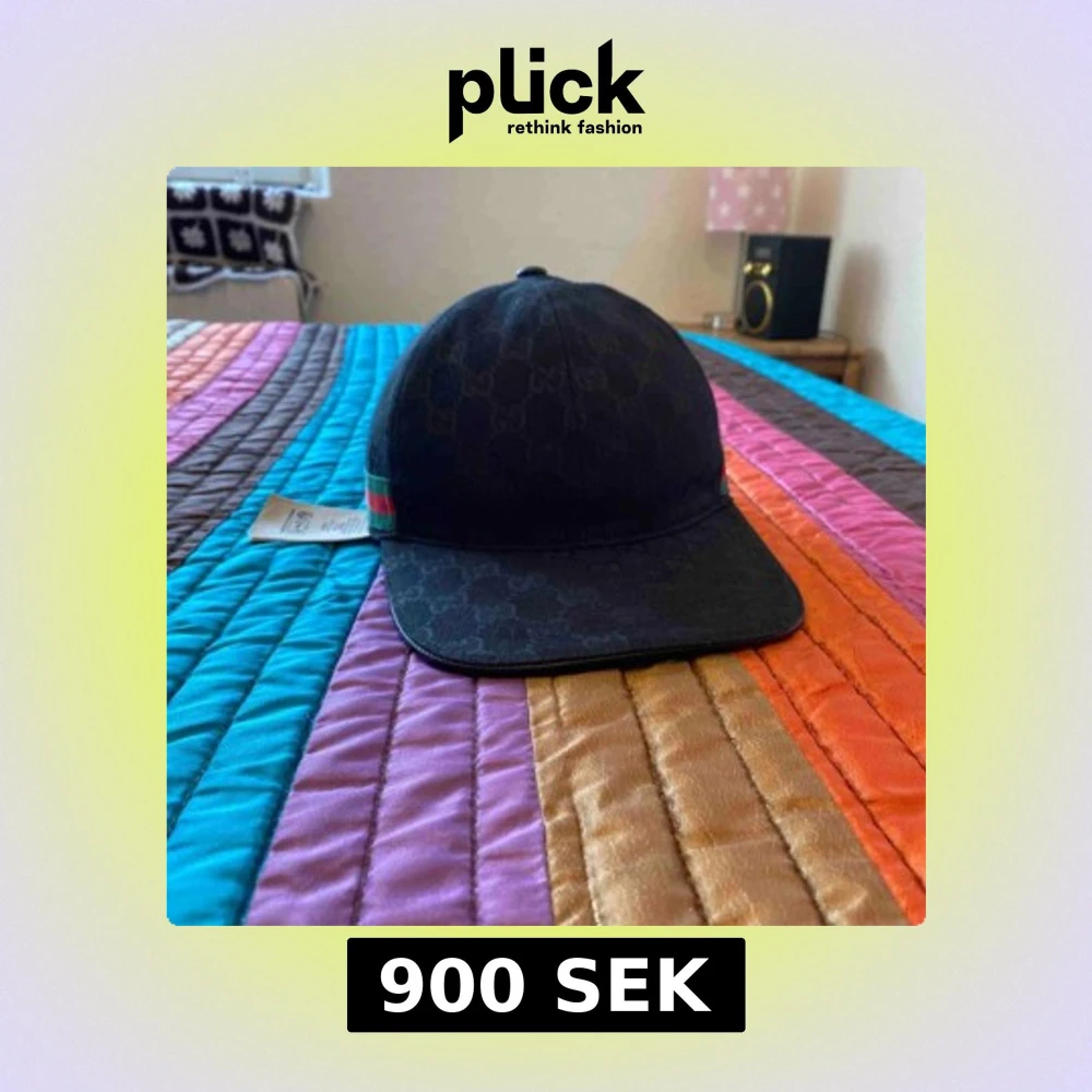 Säljer en svart keps från Gucci med diskret GG-monogram över hela kepsen. På sidan finns ett grönt och rött band, typiskt för Gucci. Kepsen har böjd skärm och klassisk passform.