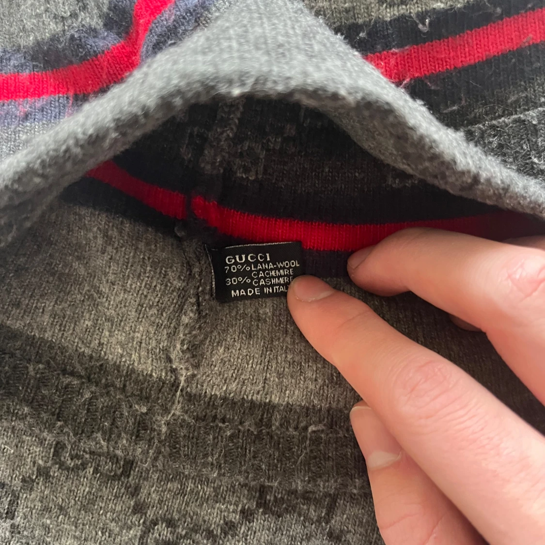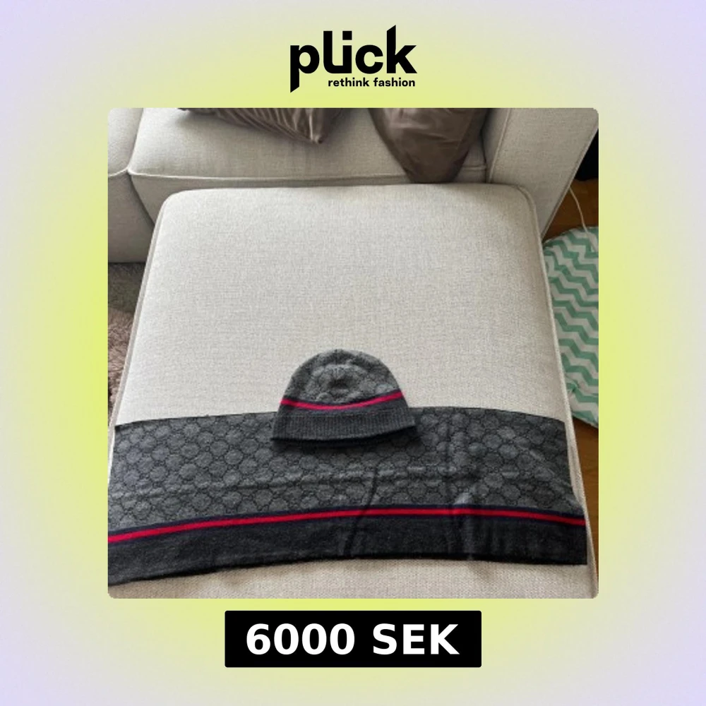 Sällsynt grå mössa och halsduk från Gucci med diskret GG-mönster och en röd/blå rand. Tillverkad i en lyxig blandning av ull och kashmir för extra mjukhet och värme. Pris kan diskuteras vid snabb affär.