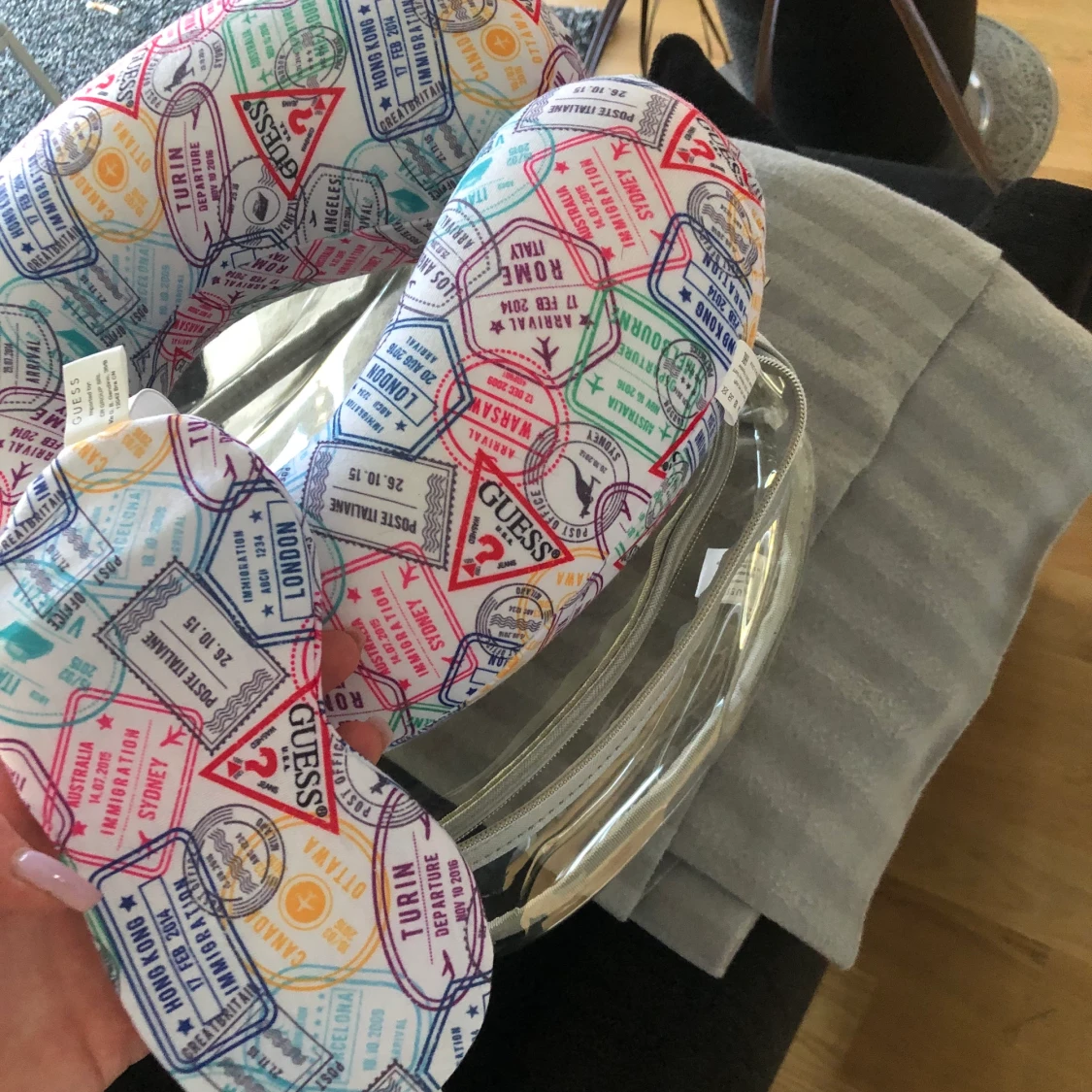 säljer detta kit ifrån guess, i köpet ingår väskan som sakerna ligger i, nackkudde och ögonbindel. Detta kan du använda till din nästa resa eller bara om du vill ligga lite extra skönt hemma i sängen.