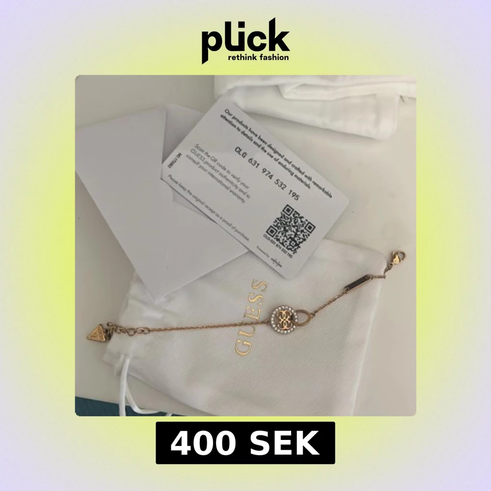Armband från Guess i roséguld med en rund berlock dekorerad med gnistrande stenar och Guess-logga i mitten. Kedjan är tunn och har en liten trekantig Guess-tag vid låset. Använd vid 1 eller 2 tillfällen, som ny. Medföljer dust bag