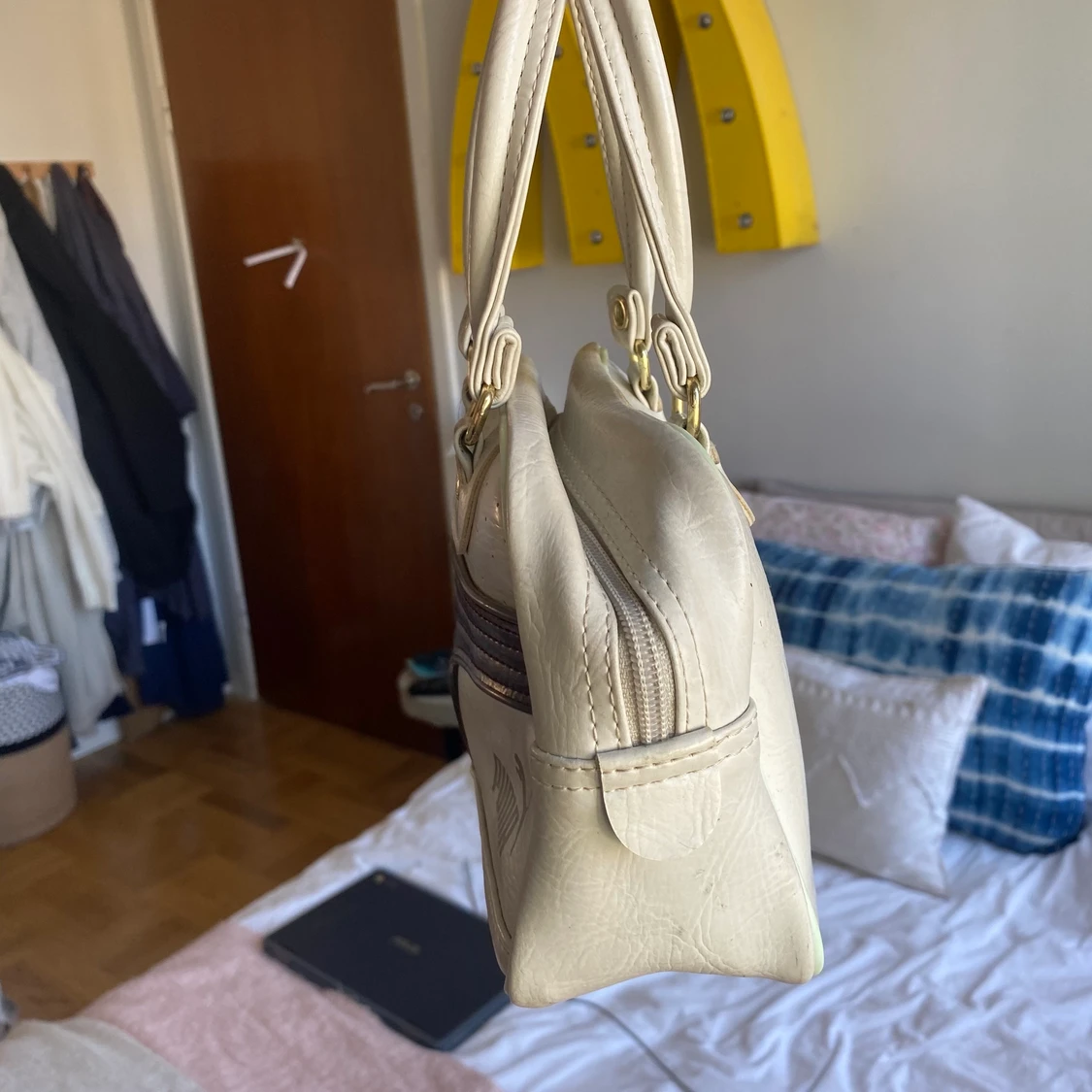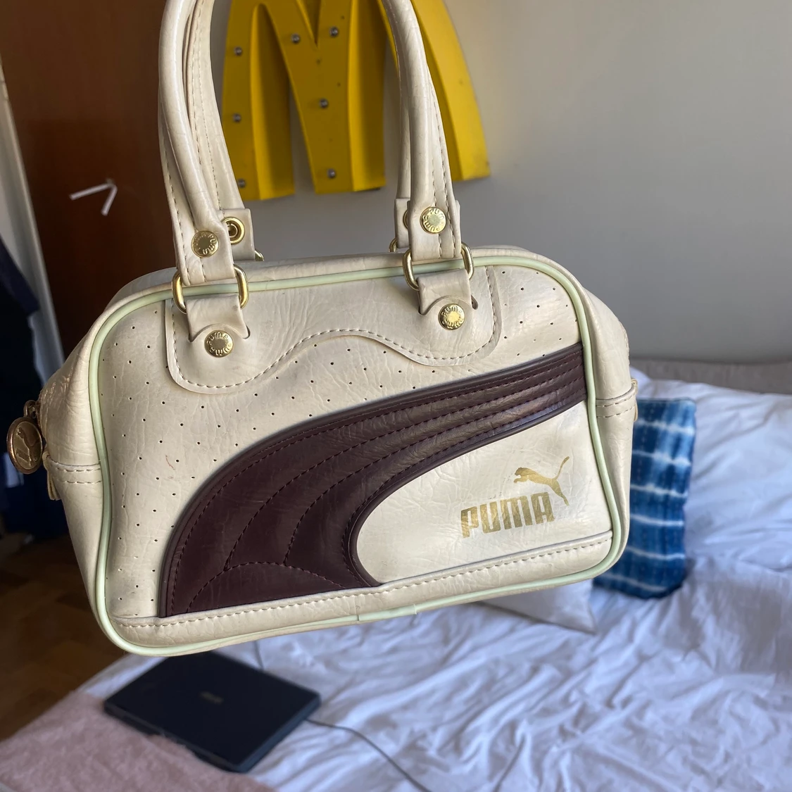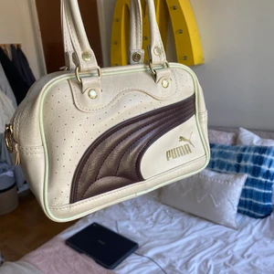 Vintage handväska från puma. Väskan är beige med ljusgröna detaljer på kanterna. Köpt second hand och därav kan priset diskuteras.