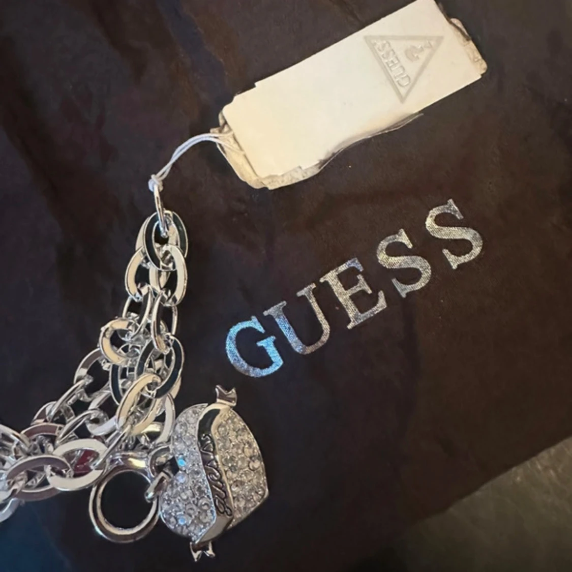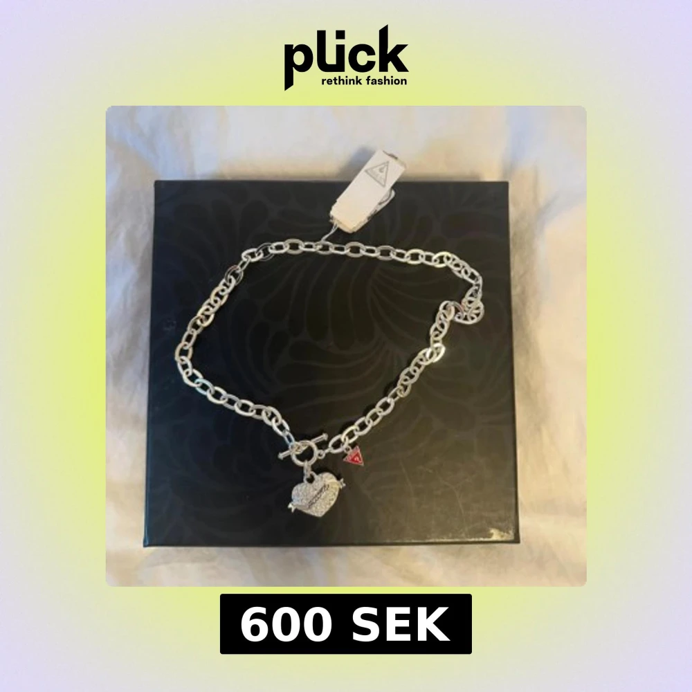 Stilrent halsband från Guess i silverfärg med grov kedja och toggle-lås. Hängsmycket är ett glittrigt hjärta med Guess-logga och små stenar, samt en röd triangelberlock med Guess-märke. Perfekt statement-piece för att lyfta din outfit