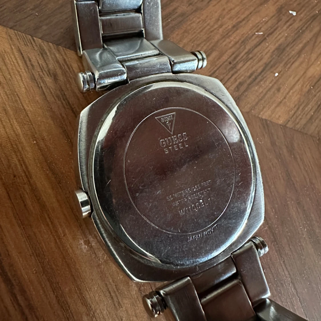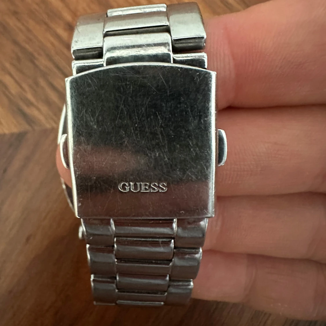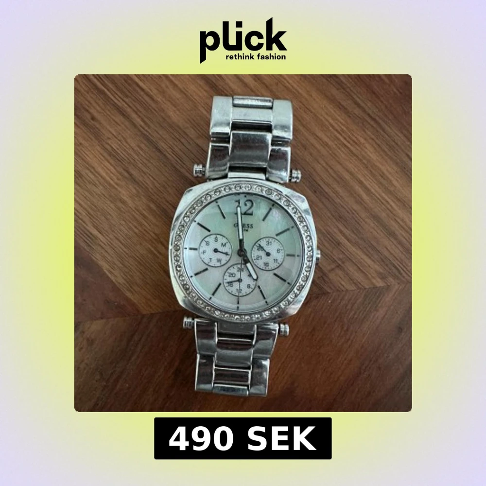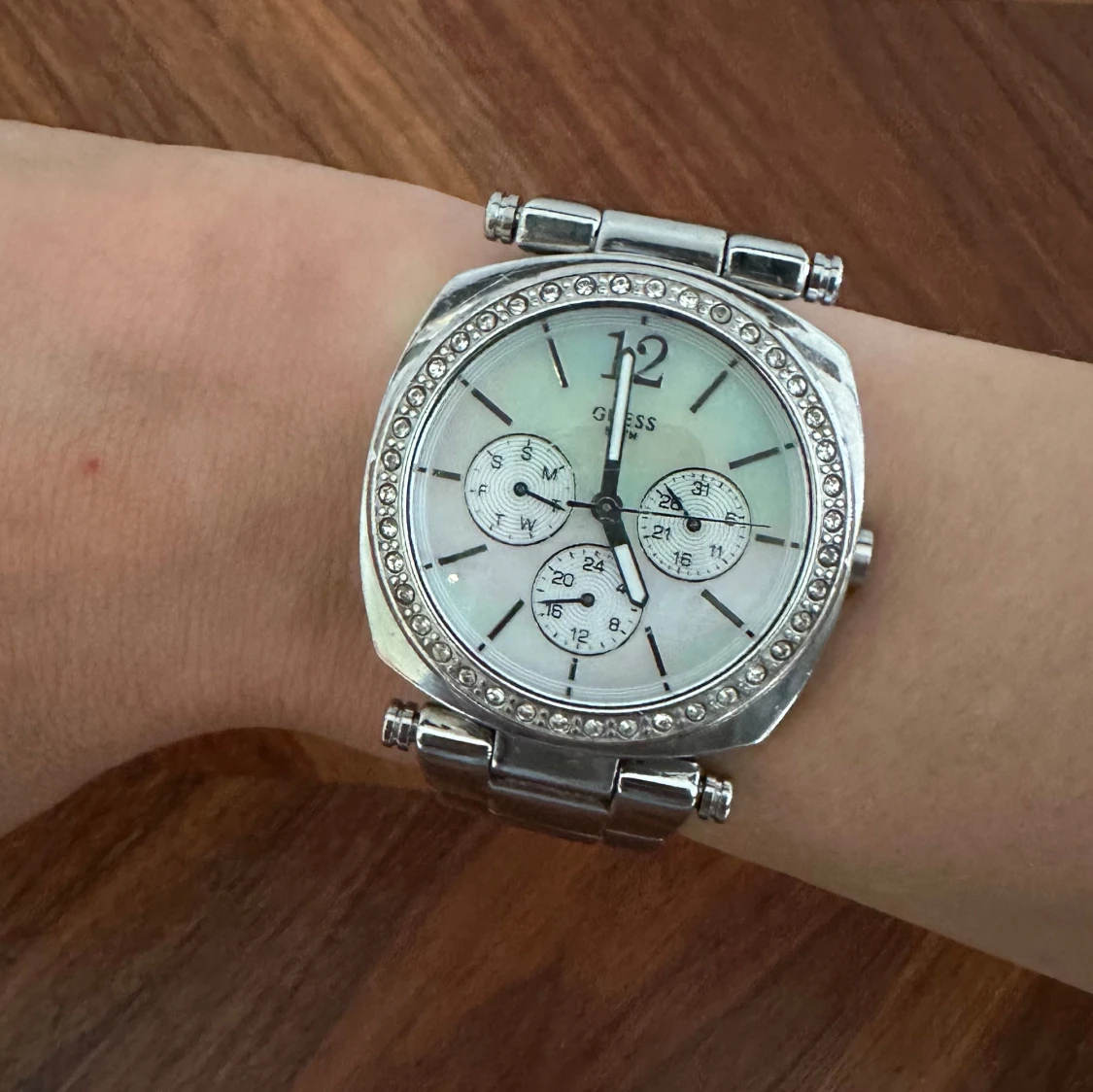 Säljer en snygg silverfärgad klocka från Guess med länkarmband i rostfritt stål och glittrande stenar runt urtavlan. Urtavlan är pärlemovit. Perfekt accessoar för att lyfta din stil.
