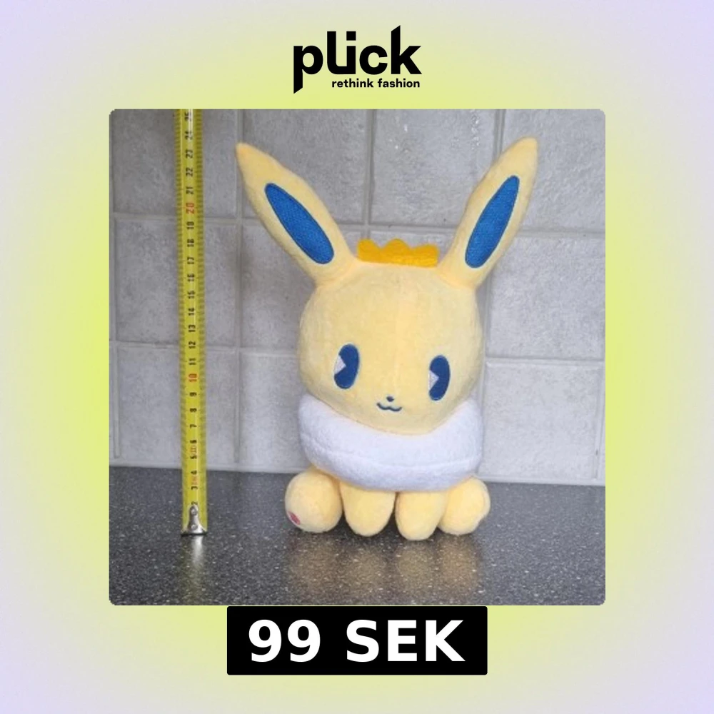 Söt gul Eevee plush med stora blå ögon och öron. Den har en vit krage och en liten gul krona på huvudet. Perfekt för kramar och lek!
