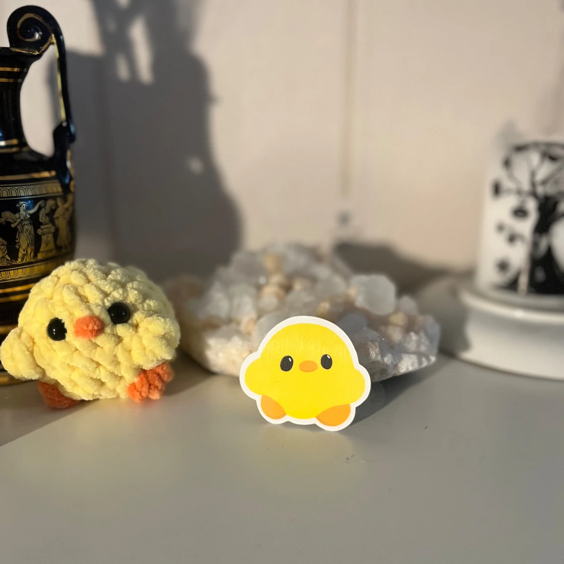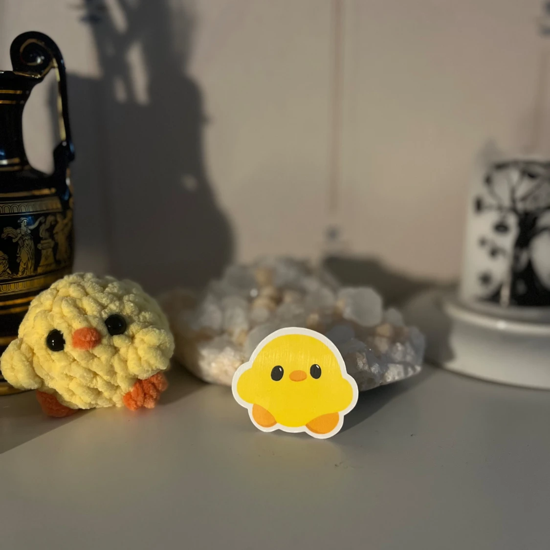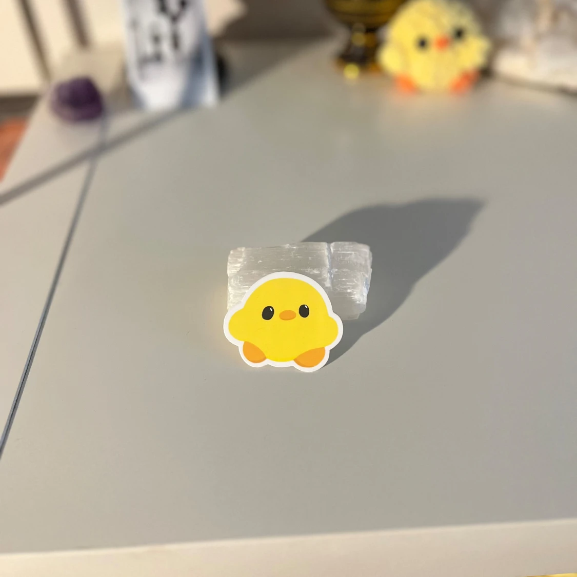 Ett supersött klistermärke som föreställer en gul kyckling med orange fötter och svartvita ögon. Perfekt för att dekorera din laptop, anteckningsbok eller mobilskal. Klistermärket har en vit kant runt motivet som ger det en fin inramning.