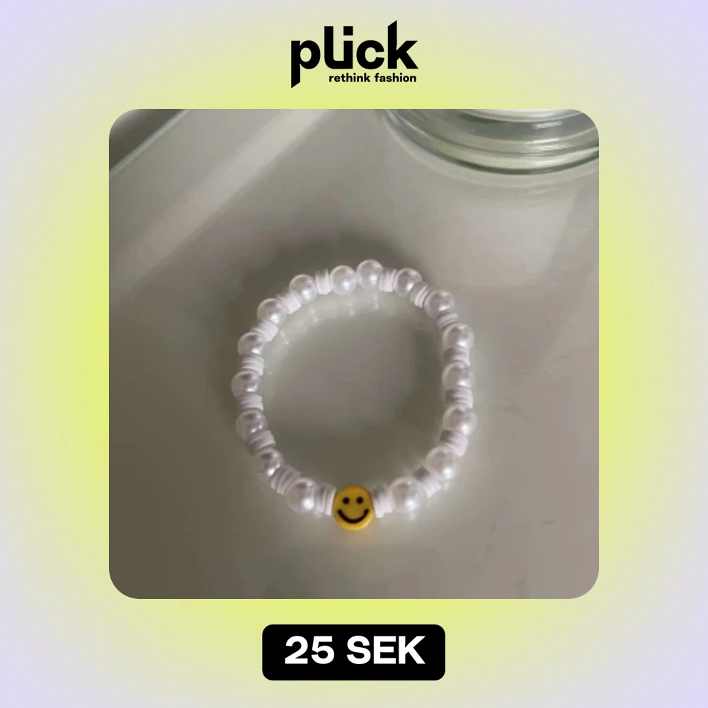 Säljer ett supergulligt armband med vita pärlor och en glad gul smiley i mitten. Perfekt för att liva upp vilken outfit som helst! Passar både till vardags och fest.