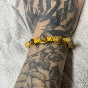 ”Eye of sunshine”, den gula serien, med 9 st stenpärlor i olika mönster. Handgjord med bomullstråd, 17,5cm från första till sista knut, 30cm från ända till ända. Det gör armbandet ganska storleksbrett. Kan användas som olika storlekar.