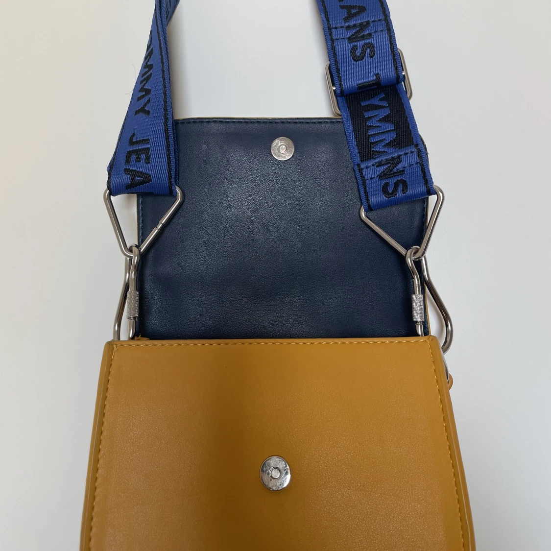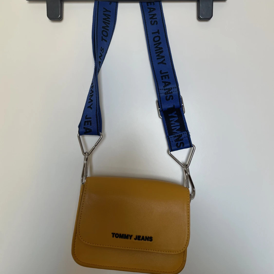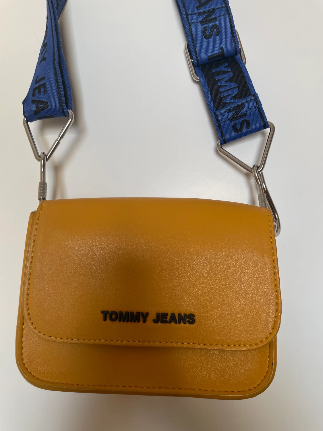 Gul Tommy hilfiger crossbody väska med blå band, silver detaljer