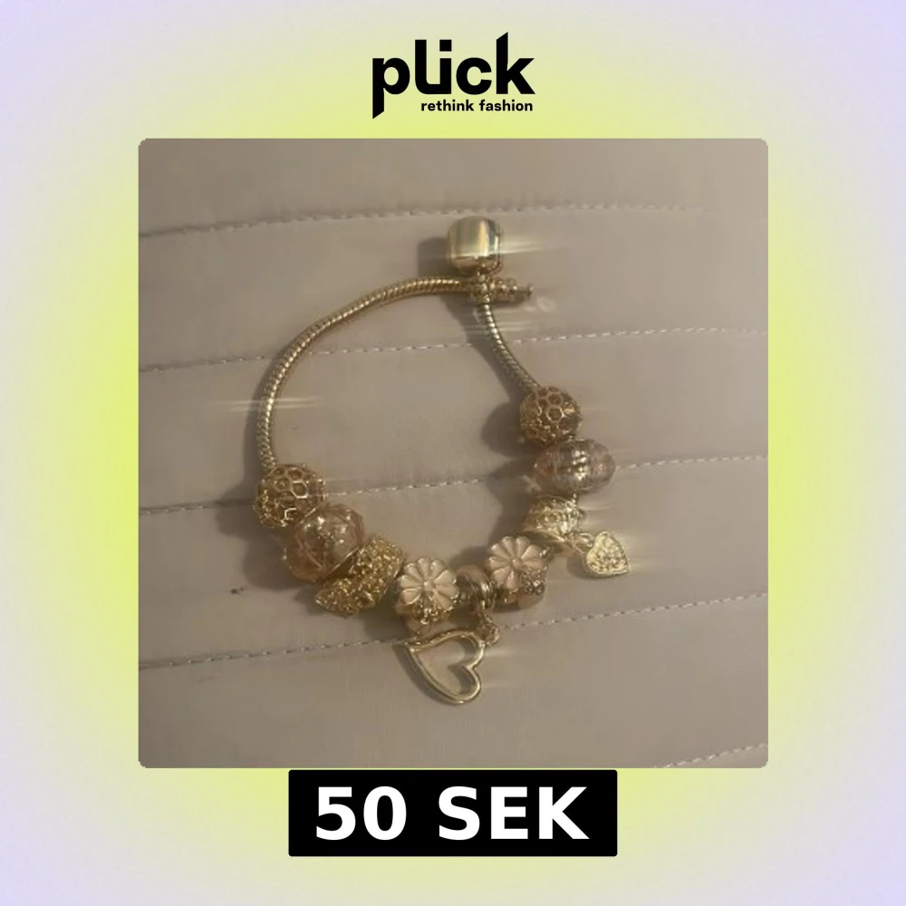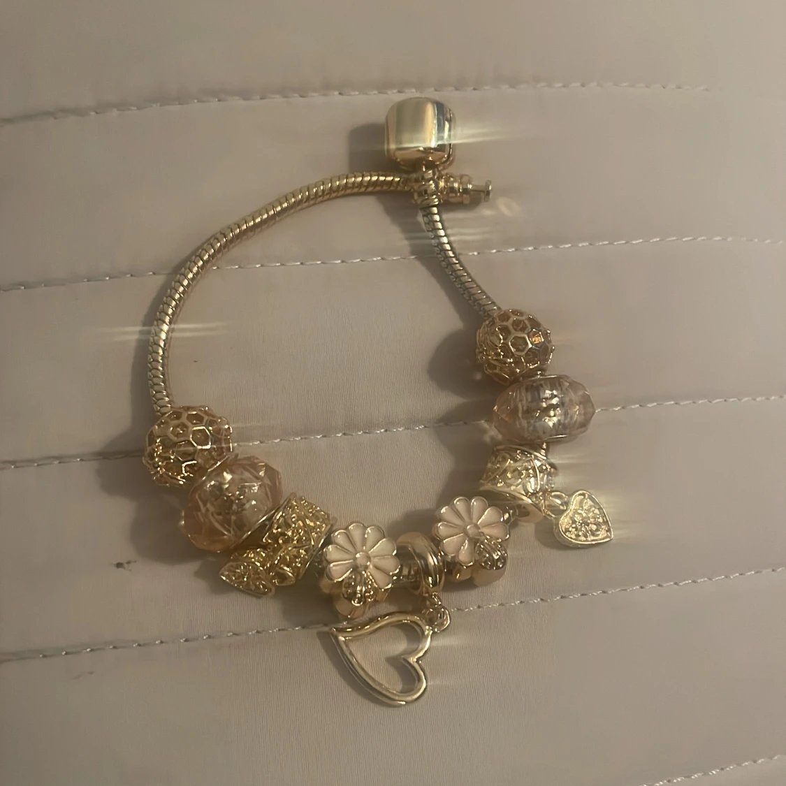 Charmigt armband i guldton med flera detaljerade berlocker, bland annat hjärtan och blommor. Armbandet har glittriga och transparenta pärlor samt fina utskurna mönster. Perfekt accessoar för att lyfta din outfit. Jättefint Pandora liknande armband .