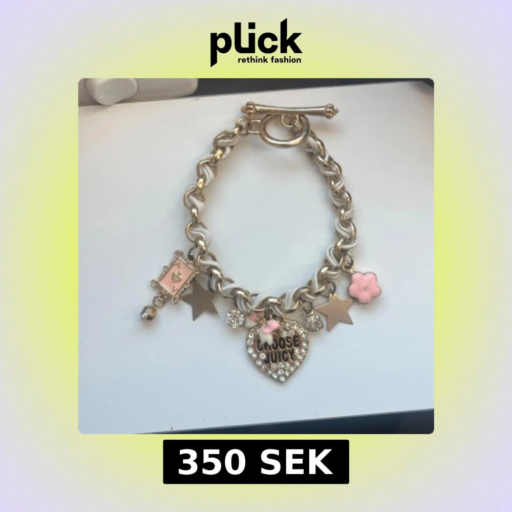 Charmarmband från Juicy Couture i guldton. Dekorerat med flera berlocker: hjärta med texten 'Choose Juicy' och strass, rosa blomma, stjärnor, rosa ram med hjärta och små kristaller. Har tyvärr lite missfärgningar och bucklor men inget som man tänker på. Perfekt statement piece för dig som gillar söta detaljer. Kontakta för fler bilder och frågor🩷🌸