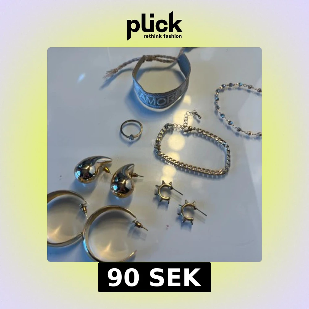 Säljer ett set med flera smycken: två par stora guldiga örhängen, ett par mindre örhängen med taggar, ett par droppformade örhängen, en tunn ring, ett armband, ett pärlarmband och ett tygarmband☺️☺️allt är i guld! Måste få bort massa saker så säljer endast i kit!
