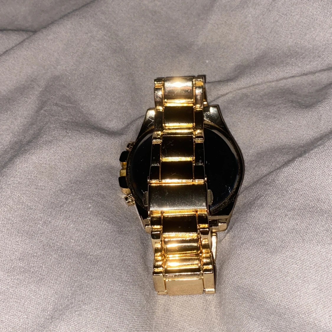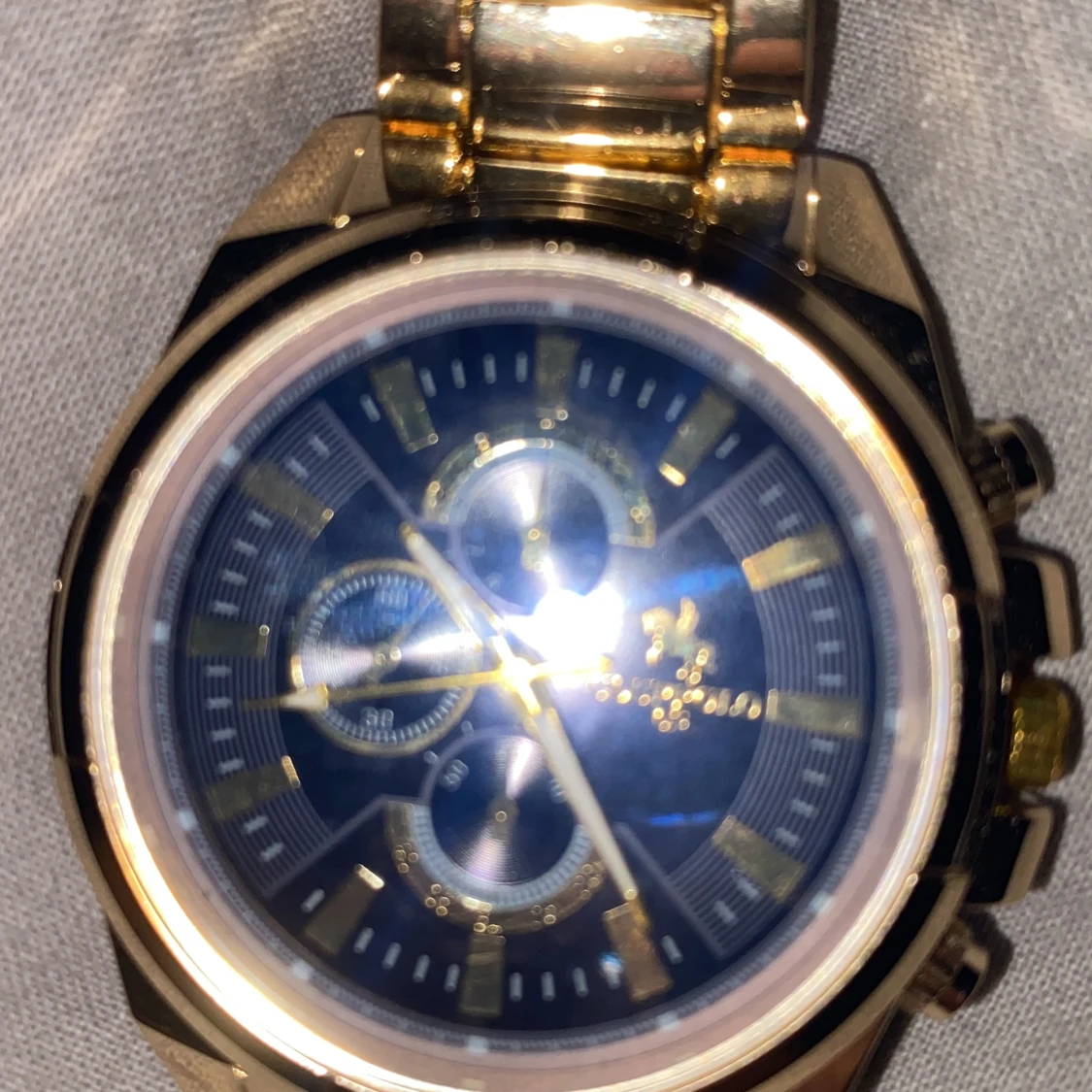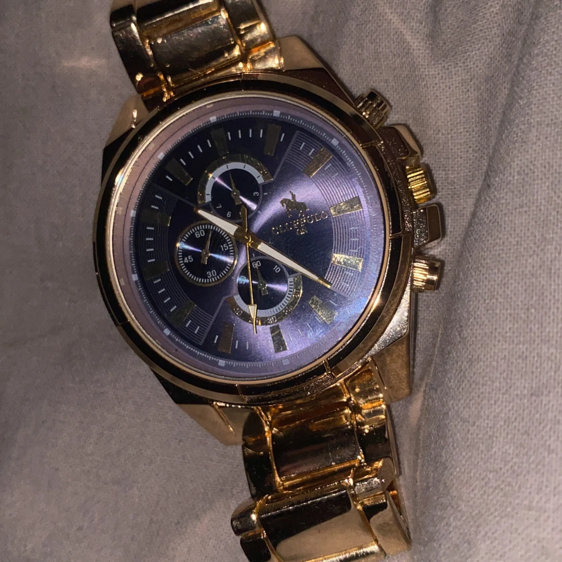 En tvär fet guld klocka som har blå urtavla. Skicka 9/10 för ja har ingen box eller nåt sånt. Nypris 2300kr mitt pris är 799. Märket är cluppolo. Mvh Damian