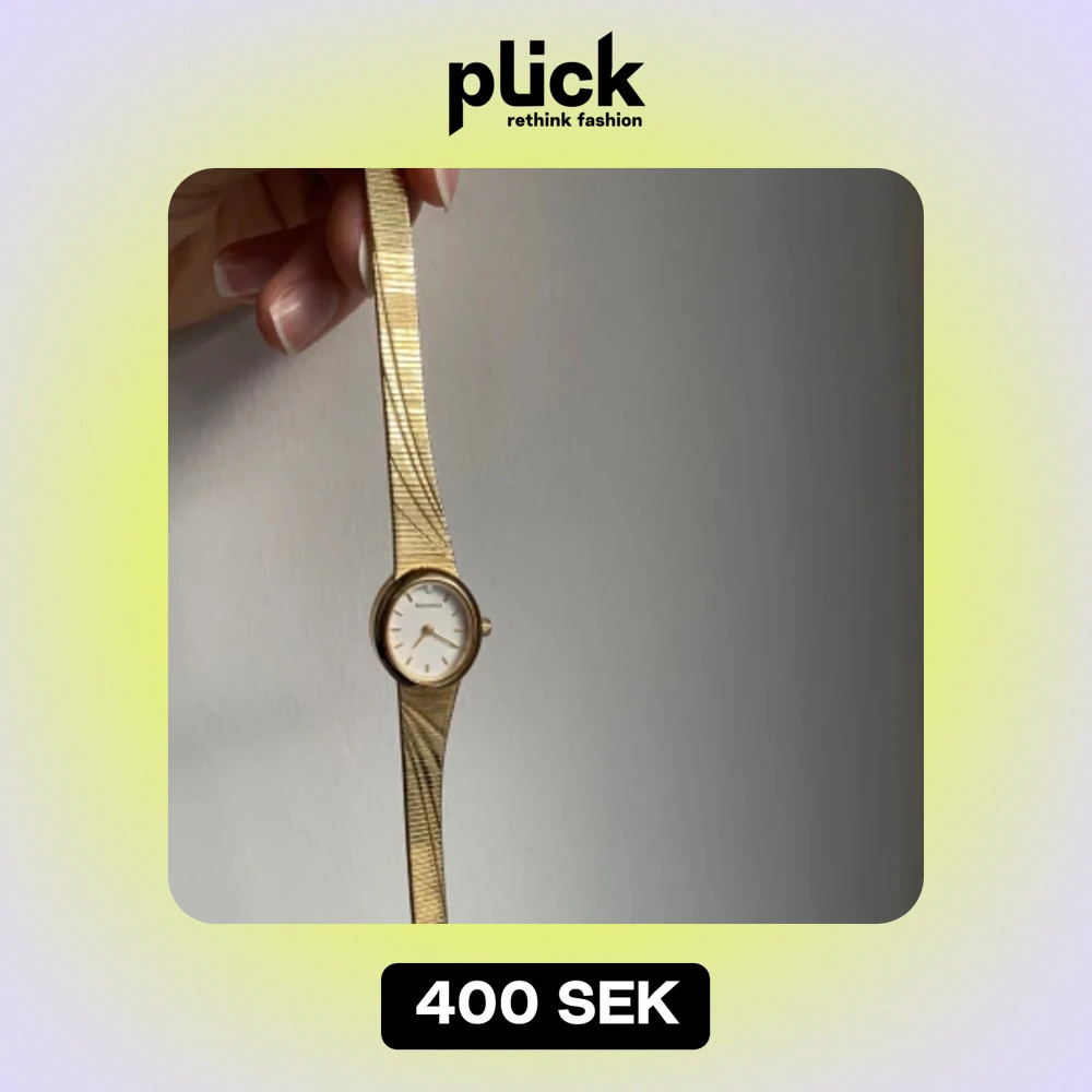 Så gullig liten guldfärgad klocka, köpt på en vintagebutik i London för något år sedan. Mätte till 15cm runt när klockan var ”stängd”. Har aldrig försökt få den att funka utan bara haft som accessoar men går säkert att fixa för en som vill.
