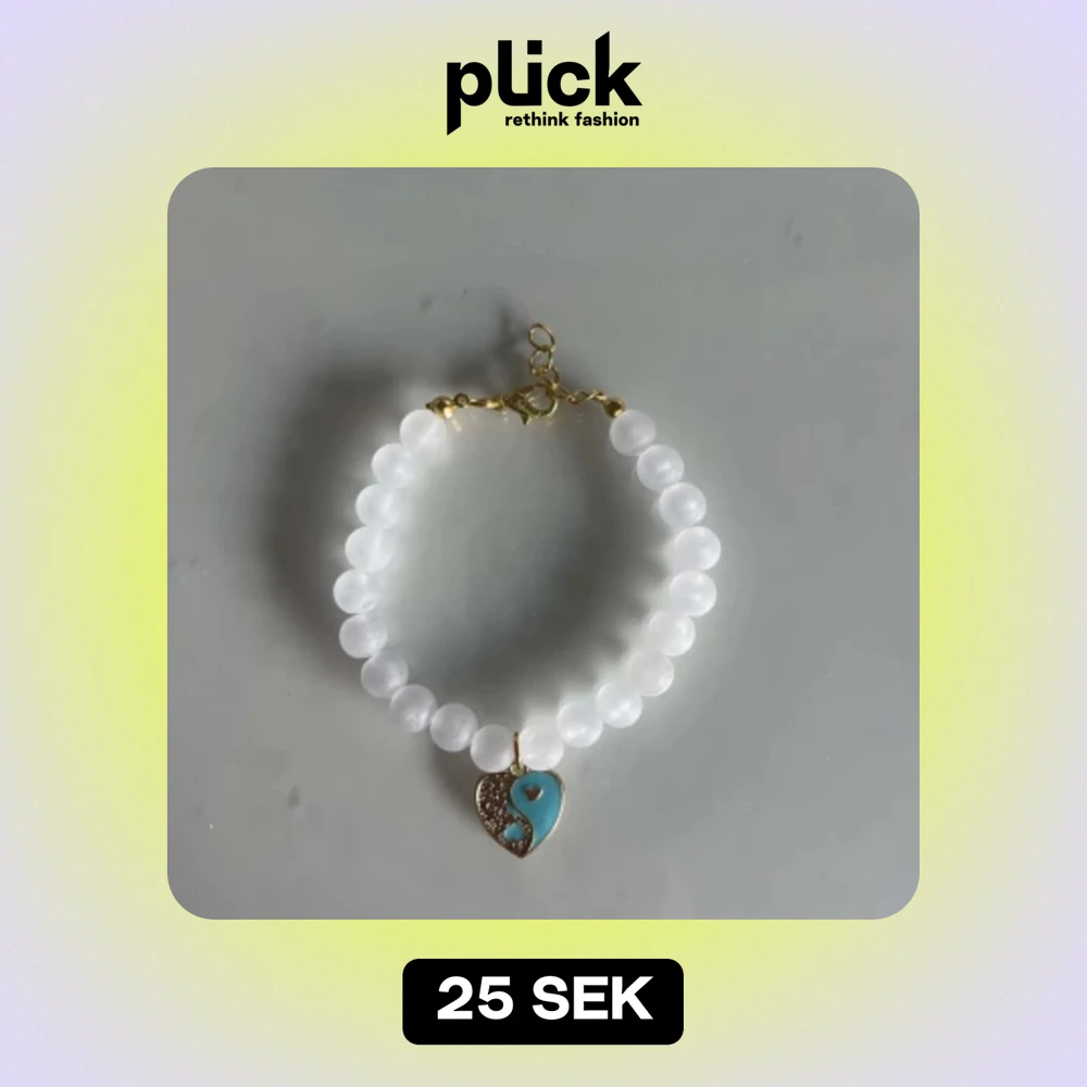 Snyggt armband med vita pärlor och ett unikt hänge i form av ett hjärta. Hänget är delvis turkost och delvis guldigt med små hjärtan inuti. Perfekt för att ge en romantisk touch till din outfit!