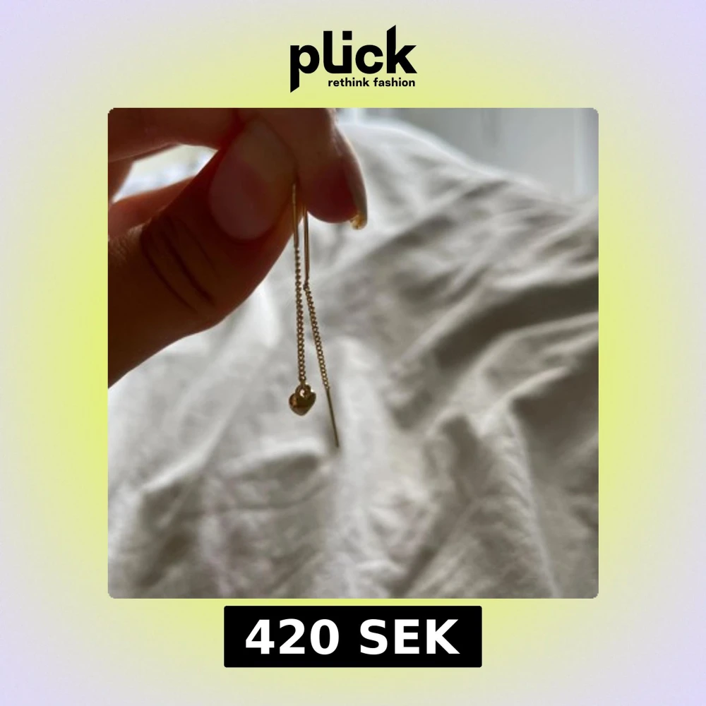 Säljer ett par tunna, guldiga örhängen med kedja och små hjärtformade detaljer. De har en minimalistisk design och träs igenom örat för en snygg look. Perfekt för dig som gillar stilrena smycken med en söt twist.