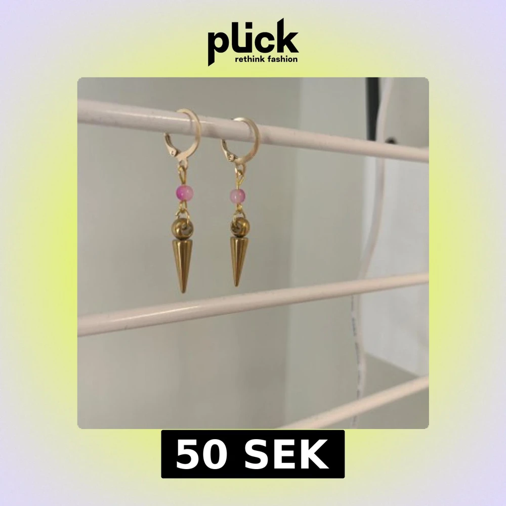Coola örhängen i guld med spetsig konformad hängande detalj och en liten rosa pärla ovanför. Perfekt för dig som gillar att sticka ut med accessoarer som har både färg och edge. I rostfritt stål och handgjort