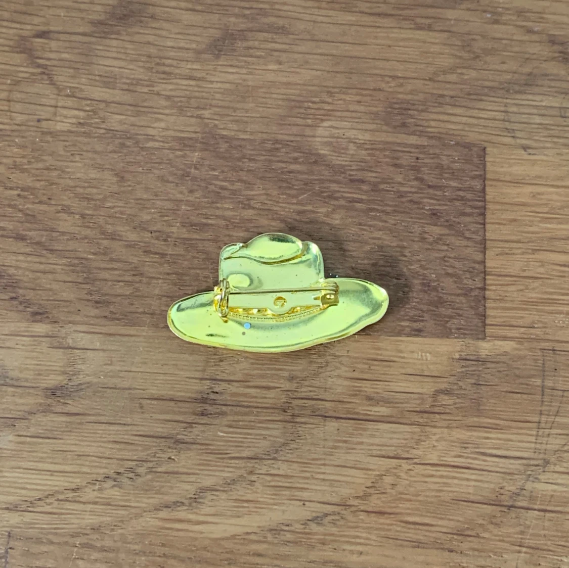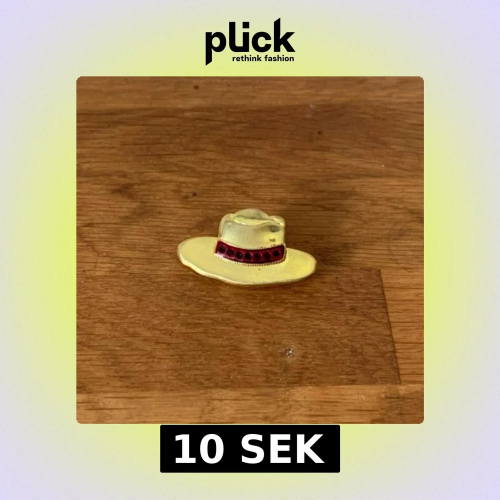 Cool brosch i form av en cowboyhatt i guldfärgad metall med ett rött band och svarta prickar runt hatten. Perfekt accessoar för att ge din outfit en unik och lekfull touch.