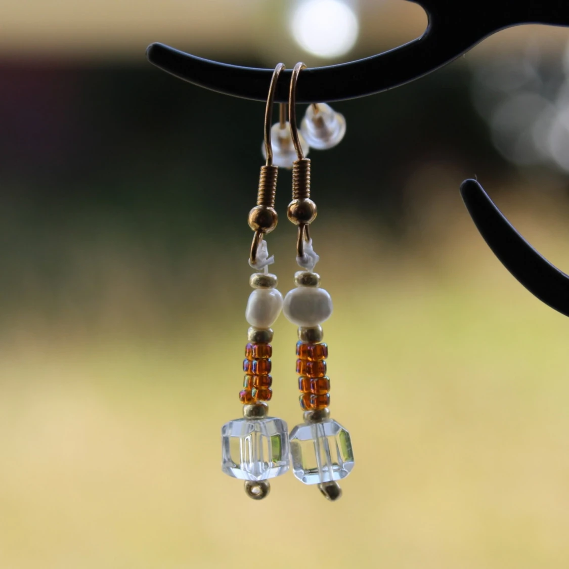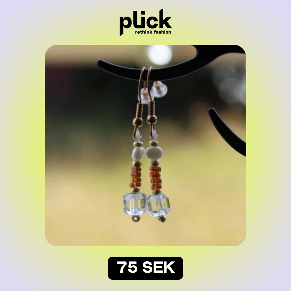 Säljer ett par superfina handgjorda örhängen med en mix av vita pärlor och glaspärlor. De har en elegant design med små guldiga detaljer och genomskinliga glaspärlor längst ner. Perfekta för både vardag och fest! ✨